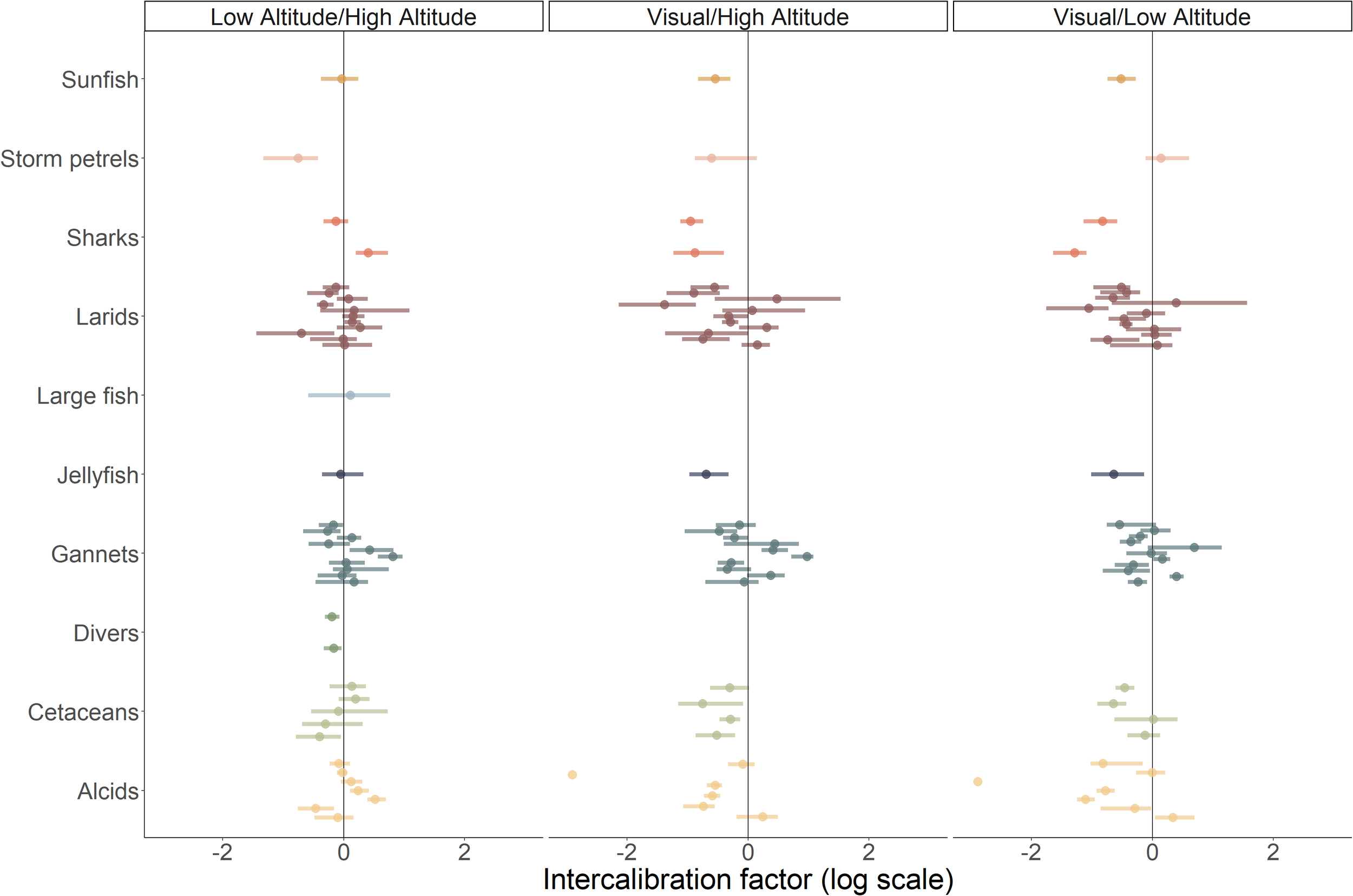 In this study, we aimed to establish general intercalibration factors that allow the transition between aerial visual and digital monitoring methods. To this end, we carried out 14 surveys conducted across five distinct locations, using both visual monitoring at low altitude and digital monitoring at both low and high altitudes, encompassing various seasons, and focused on 15 groups of species, including marine birds, cetaceans, sharks, large fish and jellyfish. Intercalibration was tested based on the ratio of abundance estimated from data collected by the different methods. Buckland et al. (2012) emphasized how crucial it is to take into account that these factors are likely to vary across species, locations and seasons. We thus explored, by means of linear models, whether the species under study or site-specific conditions influenced intercalibration factors.