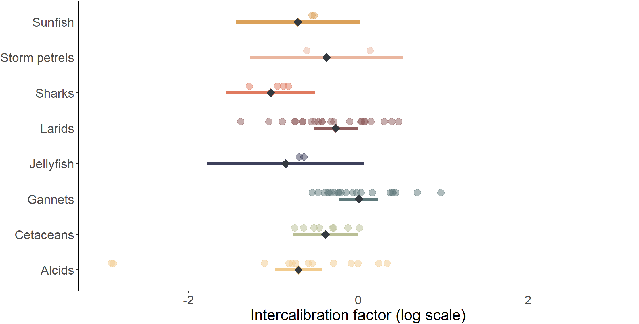 There was high between-species group heterogeneity of intercalibration factors (Figure 5). Two species groups, large fish and divers, were not included in the model selection due to insufficient data from visual surveys. Intercalibration factors of species rarely observed during the surveys were associated with a wide confidence interval. Despite the limited intercalibration factors estimated for groups of species such as sharks, jellyfish and sunfish, the abundance estimated using visual data acquisition methods was, on average, lower than that estimated using digital methods (Figure 5). For alcids, gannets, larids and cetaceans, the taxa with the largest number of intercalibration factors estimated, the model predicted a lower intercalibration factor for alcids and a higher intercalibration factor for gannets. On average, the observed intercalibration factor for alcids was -0.78 (95% CI [-2.90–0.31]) on 13 intercalibration factors estimated, and gannets had an average intercalibration factor of 0.01 (95% CI [-0.51–0.83]) on 21 intercalibration factors estimated. Thus, for gannets, visual and digital methods produced on average relatively similar estimates, whereas for alcids the digital methods estimated on average an abundance 2.2 times higher than visual methods. For cetaceans and larids, the estimated abundance was on average higher with the digital methods compared to the visual method, with an average intercalibration factor of -0.38 (95% CI [-0.73 – -0.01]) over 8 intercalibration factors estimated for cetaceans, and an average intercalibration factor of -0.34 (95% CI [-1.20–0.43]) over 23 intercalibration factors estimated for larids.