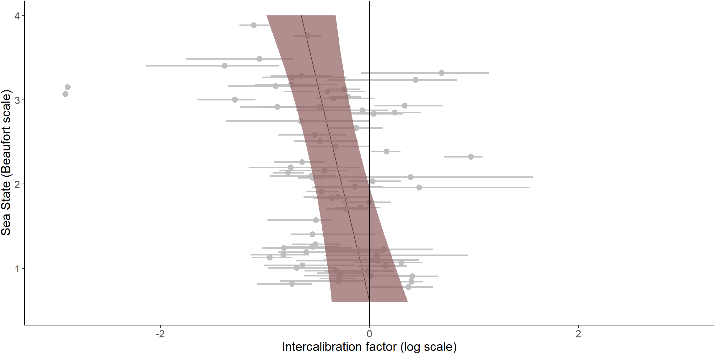 The selected model also included a significant sea state effect of -0.19 (CI 95% [-0.33 – -0.05]), indicating that, on average, the intercalibration factor decreased when the sea conditions became rough (Figure 6). This means that digital methods tended to detect more individuals, and thus estimated a higher abundance, than visual methods when sea conditions were rough.