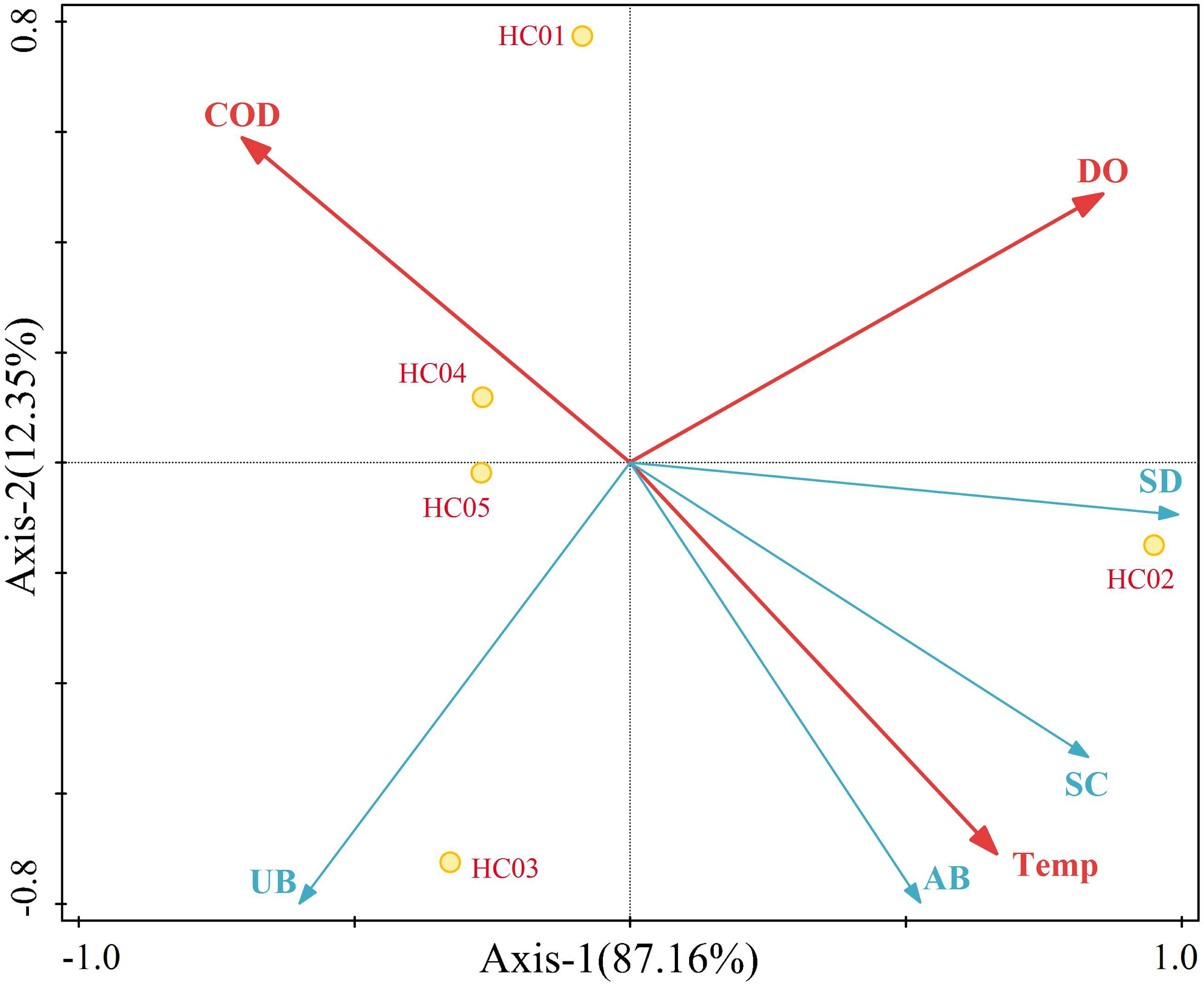 Redundancy analysis was applied to seagrass bed, in which environmental factors were used as explanatory variables and seagrass community characteristics were used as response variables. The eigenvalues of the first and second spindles were 0.8716 and 0.1235, respectively, which explained 99.51% of the variation in seagrass indicators, and the adjusted variance explanation was 98.1% (Figure 5). The interpretation rates of DO, temperature and COD were 66.9%, 31.3% and 1.3%, respectively. Among them, the coverage and aboveground biomass of seagrass were significantly positively correlated with temperature, while the density of seagrass was significantly positively correlated with DO, but significantly negatively correlated with COD. In addition, the density, coverage, and aboveground biomass of seagrass were relatively close to each other in the diagram, there was a positive correlation between them.