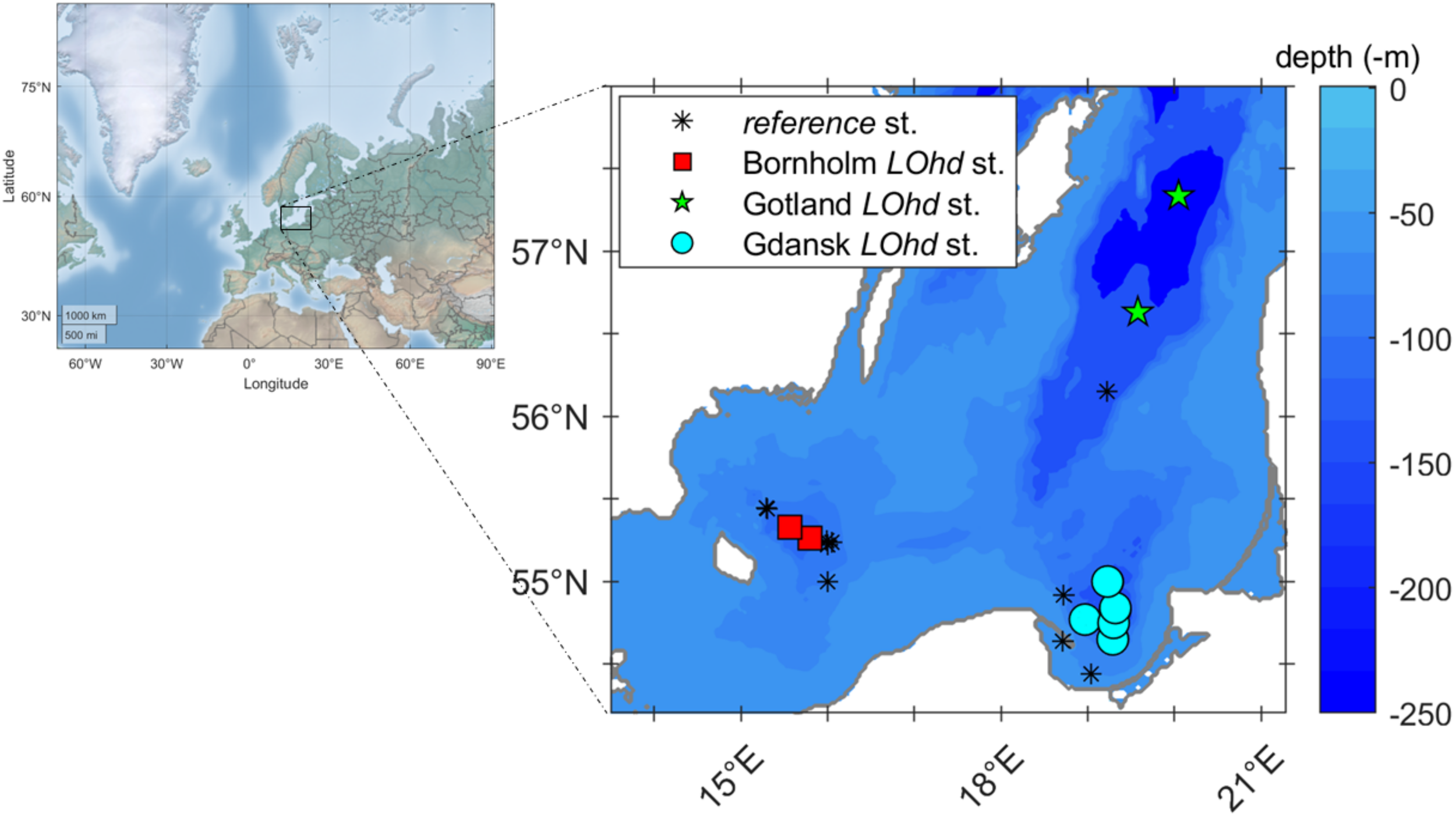 Sampling locations, i.e., Bornholm (red squares), Gdansk (cyan circles), and Gotland (green pentagrams) LOhd stations, respectively. Black stars represent reference stations. Baltic Sea bathymetry and landmark files were obtained from www.io-warnemuende.de (i.e., iow2_z_water and iow2_landmask) and are marked as the background color and gray line on the figure; maps were built using mapping toolbox for MATLAB (The MathWorks Inc.).
