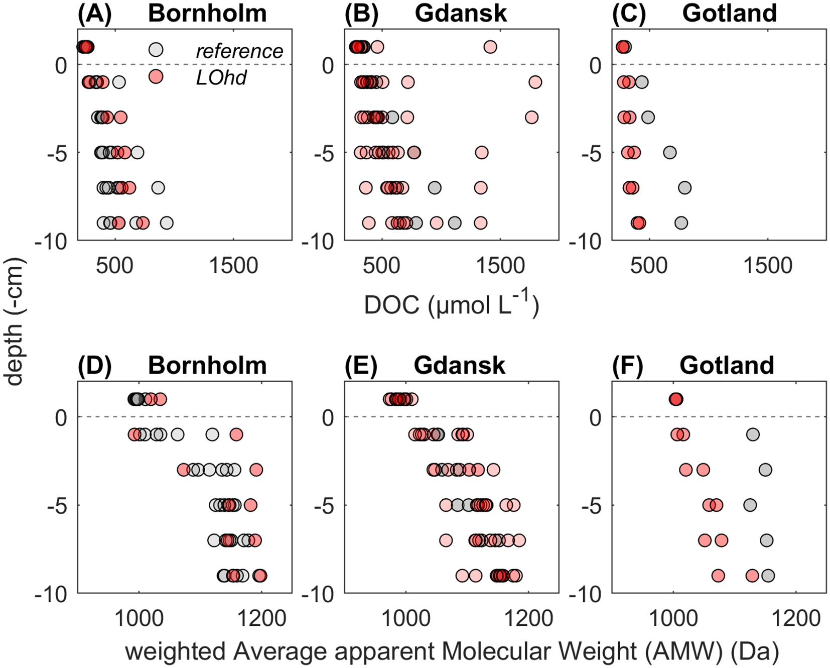 DOC (in µmol L−1) concentrations in sediment pore waters and bottom water (BW) in LOhd (in red) and reference (in gray) stations at Bornholm (A), Gdansk (B), and Gotland (C) Basins, and AMW (in Da) in sediment pore waters and BW in LOhd (in red) and reference (in gray) stations at Bornholm (D), Gdansk (E), and Gotland (F) Basins.