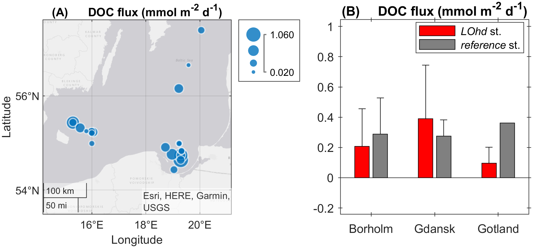 DOC diffusive fluxes (JDOC) at the investigated sites, the magnitude presented as bubble size (A) and area-averaged JDOC in Bornholm, Gdansk, and Gotland LOhd (red) and reference (gray) stations (B). The error bars represent the standard deviation of the JDOC in the corresponding area.