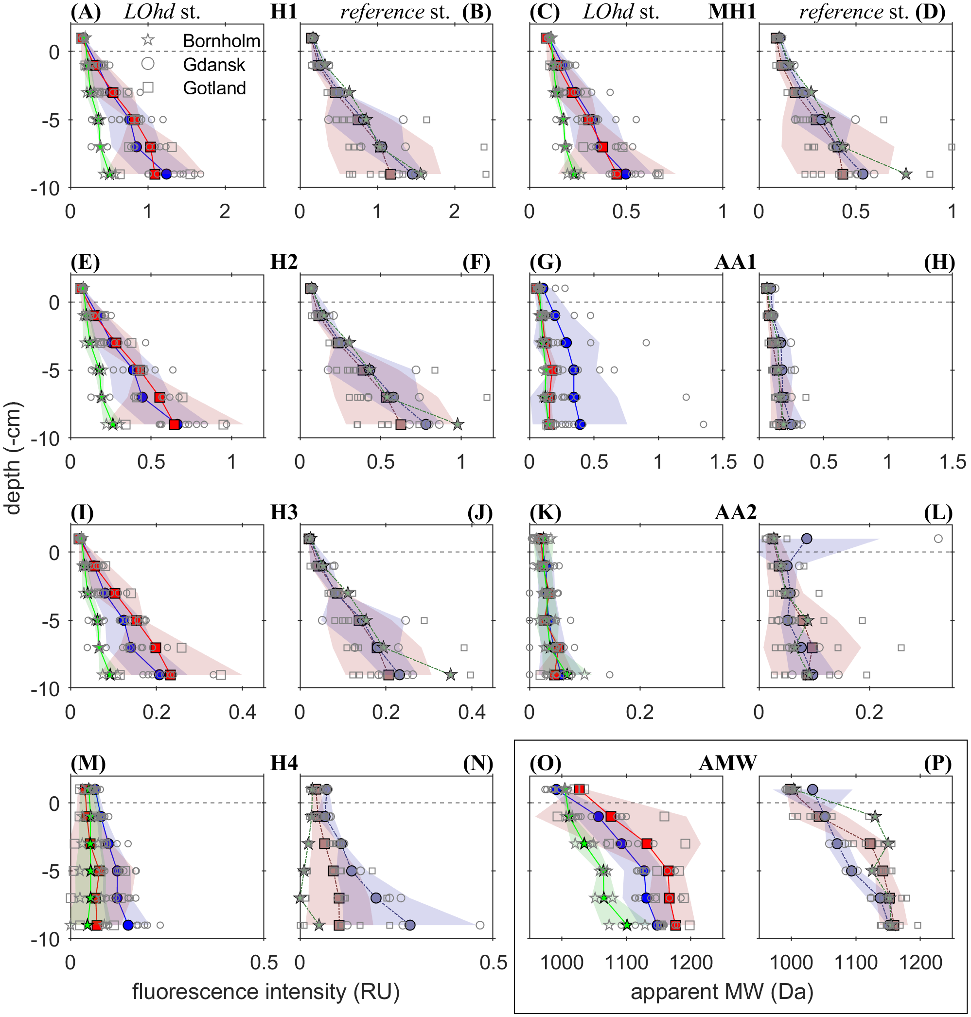 The distribution of FDOM intensity in Raman units (RU) of components resulting from PARAFAC analyses, namely, humic-like components H1, H2, H3, and H4 at stations referred to as LOhd (A, E, I, M, respectively) and reference (B, F, J, N, respectively), microbial humic-like component MH1 at stations referred to as LOhd(C) and reference(D), and also amino acid-like components AA1 and AA2 at stations referred to as LOhd (G, K, respectively) and reference (H, L, respectively). Subplots (O) and (P) show the averaged AMW within sediment pore waters at the LOhd and reference stations, respectively. The colored symbols and lines present the mean value calculated for Bornholm (in red squares), Gdansk (in blue circles), and Gotland (in green pentagrams) LOhd stations, and for Bornholm (in gray-red squares), Gdansk (in gray-blue circles), and Gotland (in green-gray pentagrams) reference stations. The shaded areas of the corresponding color represent the standard deviation of the corresponding average estimate. The dotted gray line represents the sediment–water interface. Scatter plots with open circles, squares, and stars represent individual profiles of corresponding parameters from Gdansk, Bornholm, and Gotland LOhd and reference stations on each plot, respectively.
