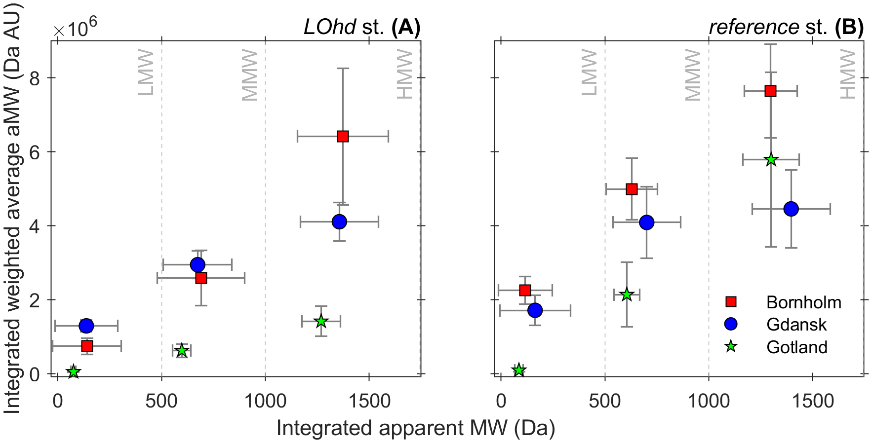 Sediment column averaged apparent MW in Da and their variability (error bars on the x-axis calculated as standard deviation from the mean), versus their abundances presented as sediment column weighted averaged aMWs and variability (error bars on the y-axis, calculated as standard deviation from the mean) for Bornholm (in red squares), Gdansk (in blue circles), and Gotland (in green stars) LOhd stations (A) and reference stations (B). The sediment column averages were calculated for stations by including all investigated depth intervals from 0 to 10 cm. The apparent MW from <100 to ~500 Da was referred to as low molecular weight (LMW); ~500 Da to 1 kDa, medium molecular weight (MMW); and MW larger than 1 kDa, high molecular weight (HMW) DOM.