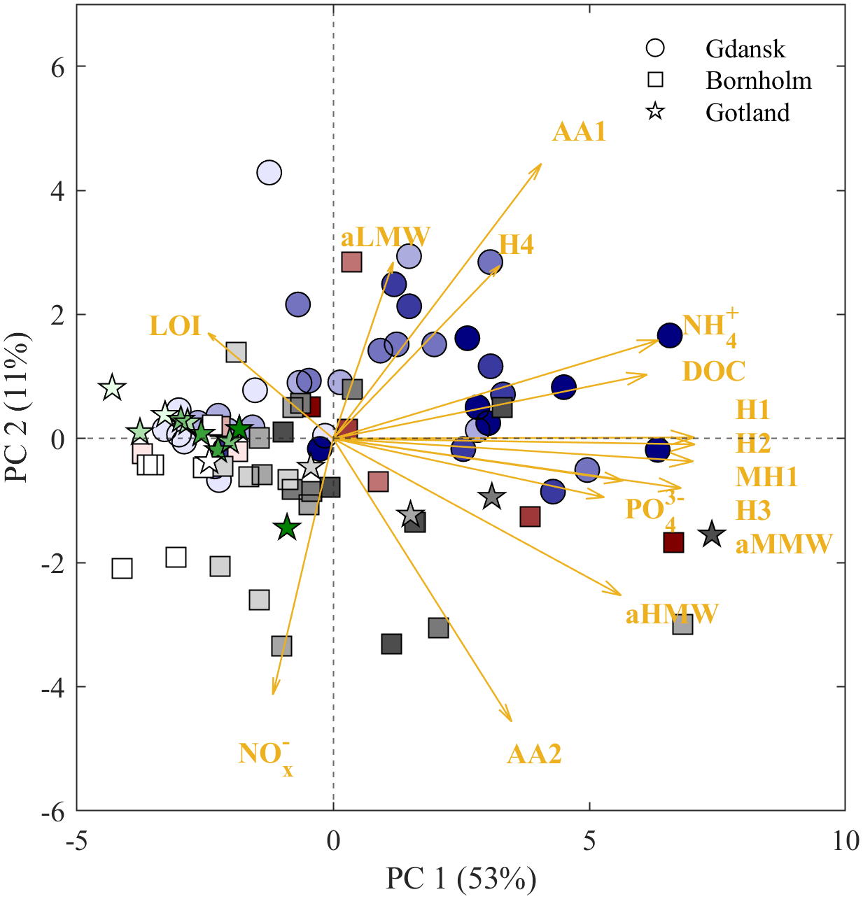 Principal component analysis biplot illustrating variance in DOM quality between sample locations. Symbols depict individual variance of samples (n = 99) from Bornholm (red squares), Gdansk (blue circles), and Gotland (green pentagrams) LOhd stations and Bornholm (gray squares), Gdansk (gray circles), and Gotland (gray pentagrams) from reference stations. The intensity of the shade of the color depicts the sediment depths at which samples were collected [the darker the shade, the deeper the depth interval, where the sample was collected (0–10 cm)]. Yellow arrows represent the strength of variability induced by variables aLMW, aMMW, and aHMW, H1–4, AA1–2, MH1, LOI, and NOx-, PO43-, and NH4+ on PC1 and PC2.