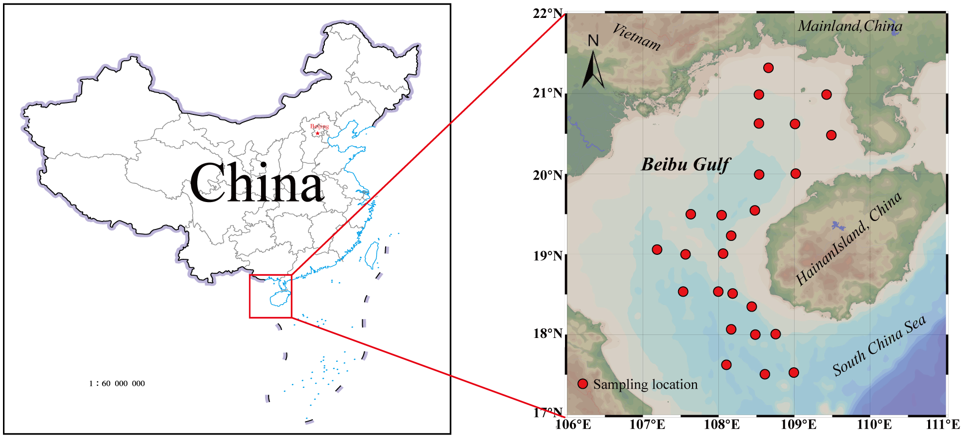 In April and August 2022, a fishing vessel equipped with a 441-kilowatt main engine was deployed in the Beibu Gulf to collect marine invertebrates via bottom trawling (Figure 1). The trawl net was 20 meters in length, 8 meters in width, and 3 meters in height, with mesh sizes ranging between 1 and 5 centimeters. All samples were stored at -20 °C before being transported to the laboratory for further analysis.