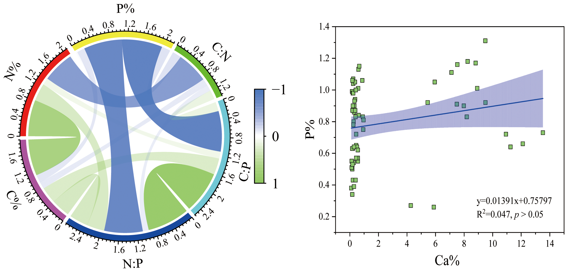 Correlation analysis revealed that the C:N and N content, C:P and P content, and N:P and P content of invertebrates in the Beibu Gulf were all significantly negatively correlated. Conversely, there was a significant positive correlation between C:P and C content, N:P and C content, N:P and N content, N content and C content (p < 0.01) (Figure 2). Notably, the correlation between the C:P and P content, as well as the N:P and P content of invertebrates, was the strongest (r > 0.8) (Figure 2), indicating that the C:P and N:P ratios were mainly influenced by the change in P content. Furthermore, the correlation analysis indicated no significant correlation between the P content of the invertebrates and the Ca content (p > 0.05) (Figure 2).