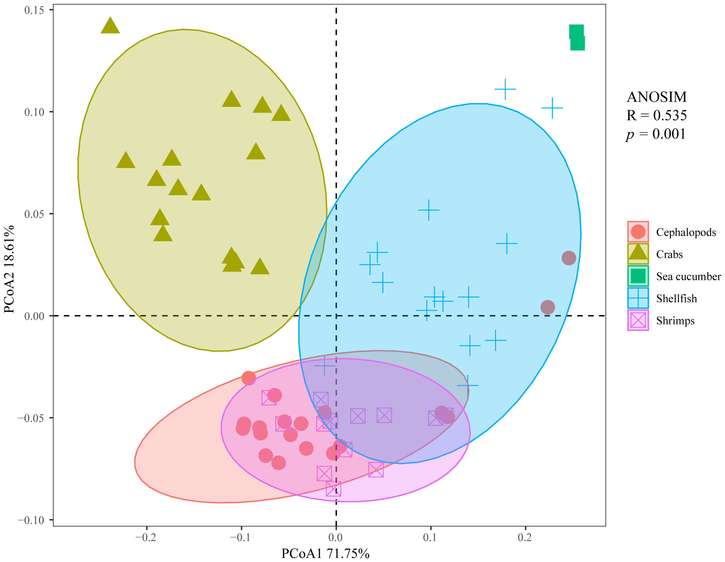 A total of 18 invertebrate species were categorized into 5 groups: cephalopods, crabs, sea cucumber, shellfish, and shrimps. The results from the ANOSIM showed that the ecological stoichiometric characteristics varied significantly among these different categories of invertebrates. Furthermore, it was observed that invertebrates from different taxa consisted of different elements (R = 0.535, p = 0.001) (Figure 3).