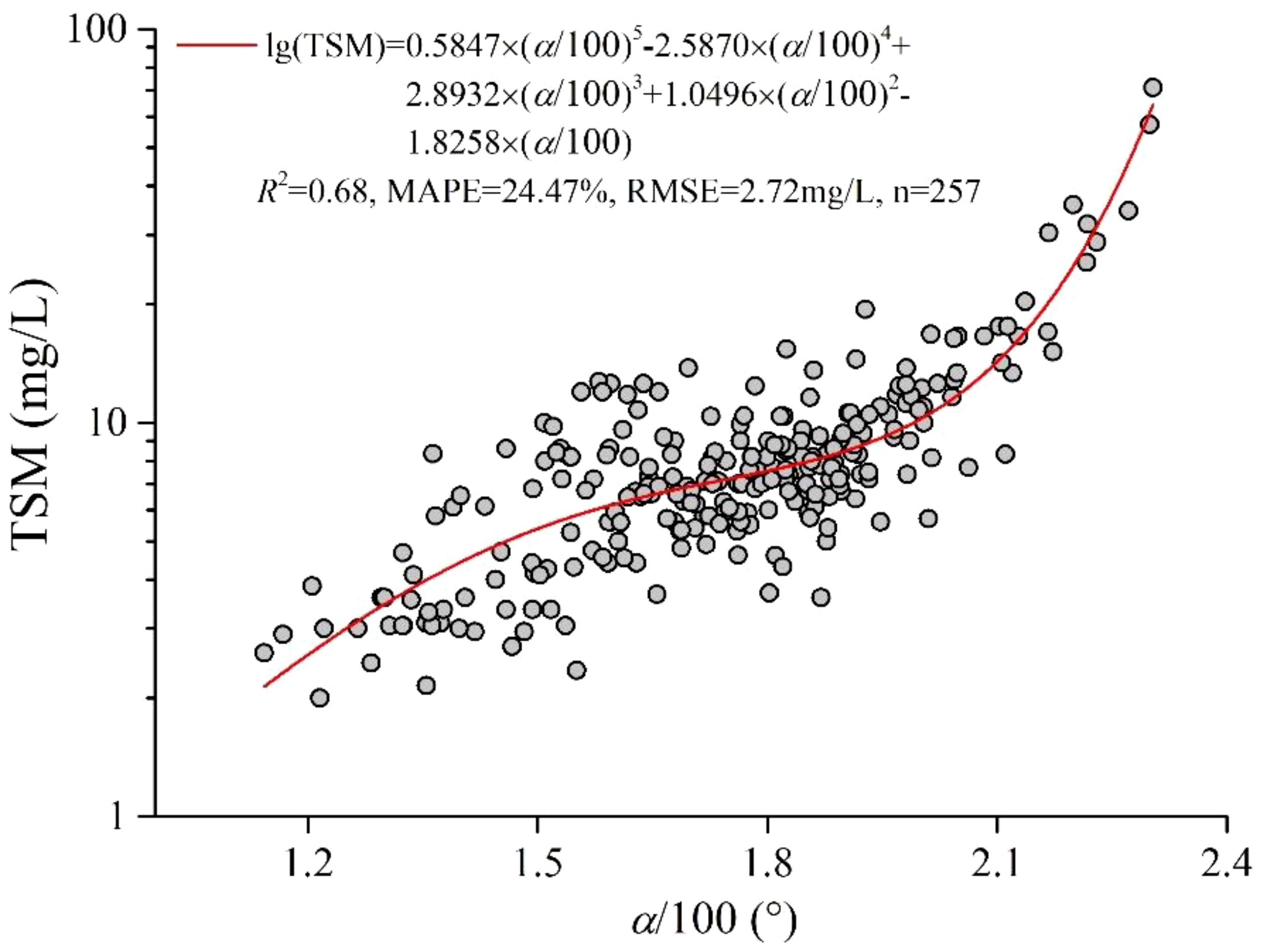Based on the applicability analysis in the previous section, the band ratio and multi-band models are more applicable to the coastal waters of Qinhuangdao than other classical TSM retrieval models. Therefore, the band ratio, multi-band combinations, and CIE hue angle (α) are selected as the primary sensitivity factors for modeling and comparative analysis. The accuracy evaluation results for each fitting model (M1~M23) are shown in Table 3. It is found that the highest R2 value of the models in linear coordinates of TSM reaches 0.80, while in logarithmic coordinates, it is only 0.68. This result is attributed to the significant increase in R2 at high TSM in linear coordinates and should be comprehensively evaluated with MAPE and RMSE. In the band ratio model, using Rrs(645)/Rrs(488) as the independent variable, the fitting model under the linear TSM coordinate is optimal (M2), with an R2 of 0.77, a MAPE of 26.35%, and an RMSE of 3.34 mg/L. Among the multi-band models, the binary linear model (M22) shows superior performance in fitting TSM in logarithmic coordinates, using Rrs(488)/Rrs(555) and Rrs(645)/Rrs(555) as independent variables, with an R2 of 0.66, a MAPE of 24.99%, and an RMSE of 3.44 mg/L. However, under the logarithmic TSM coordinate, the fifth-order polynomial model (M23), with α/100 as the independent variable, shows higher model accuracy than both the band ratio and the multi-band models, with an R2 of 0.68, a MAPE of 24.47%, and an RMSE of 2.72 mg/L. The scatterplots of TSM and α/100 are shown in Figure 2. Therefore, the model based on the CIE hue angle (α) has been established as the optimal TSM retrieval model for the research area.