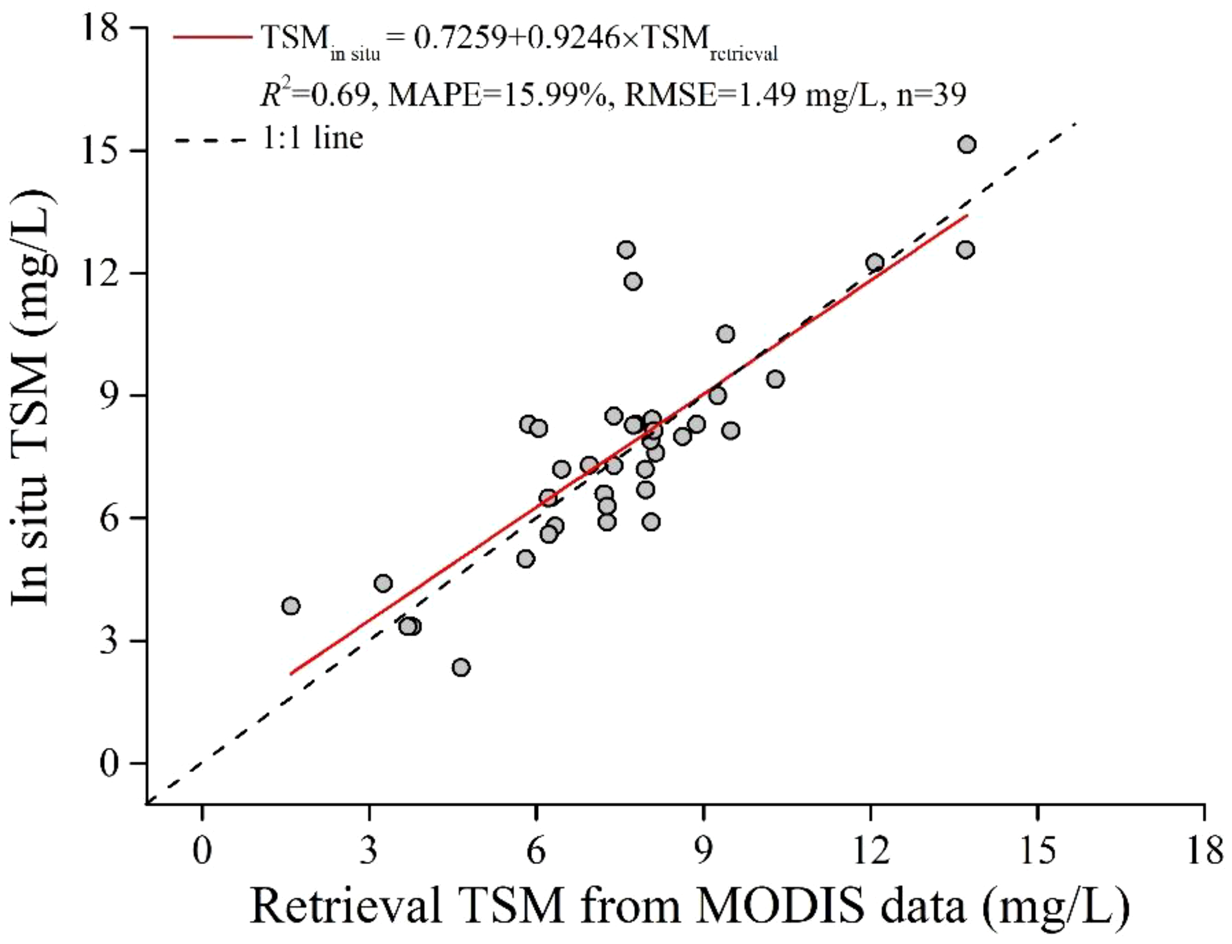 To validate the accuracy of the TSM retrieval model, matches between Aqua MODIS and in situ data were only included if the time interval between the in situ observations and the satellite overpass was less than 3 hours. Since the quality of satellite data is significantly affected by weather factors, such as clouds, this resulted in fewer valid satellite data entries. As a result, only 39 matches of in situ TSM and satellite-derived TSM were obtained from all the collected samples.