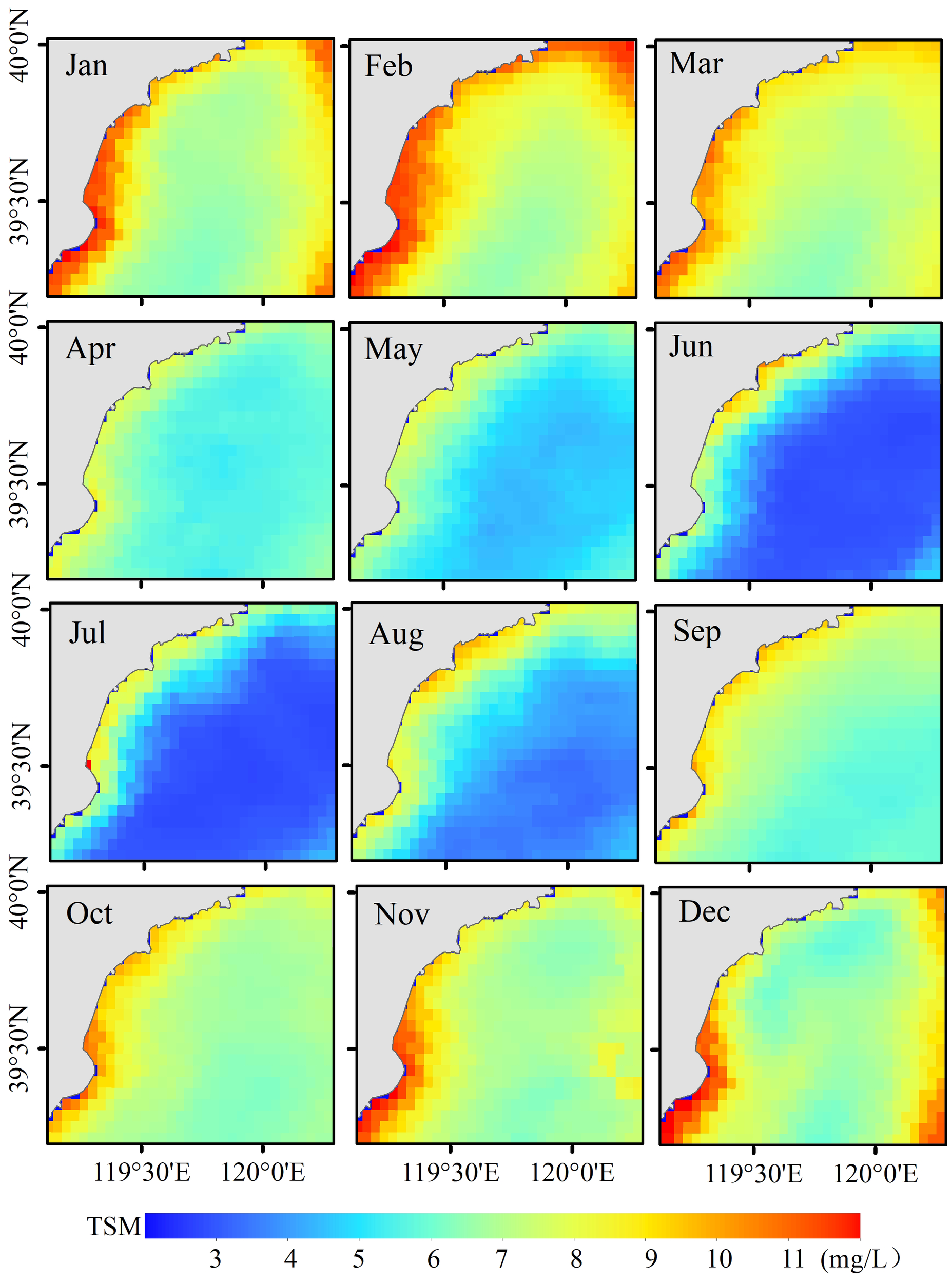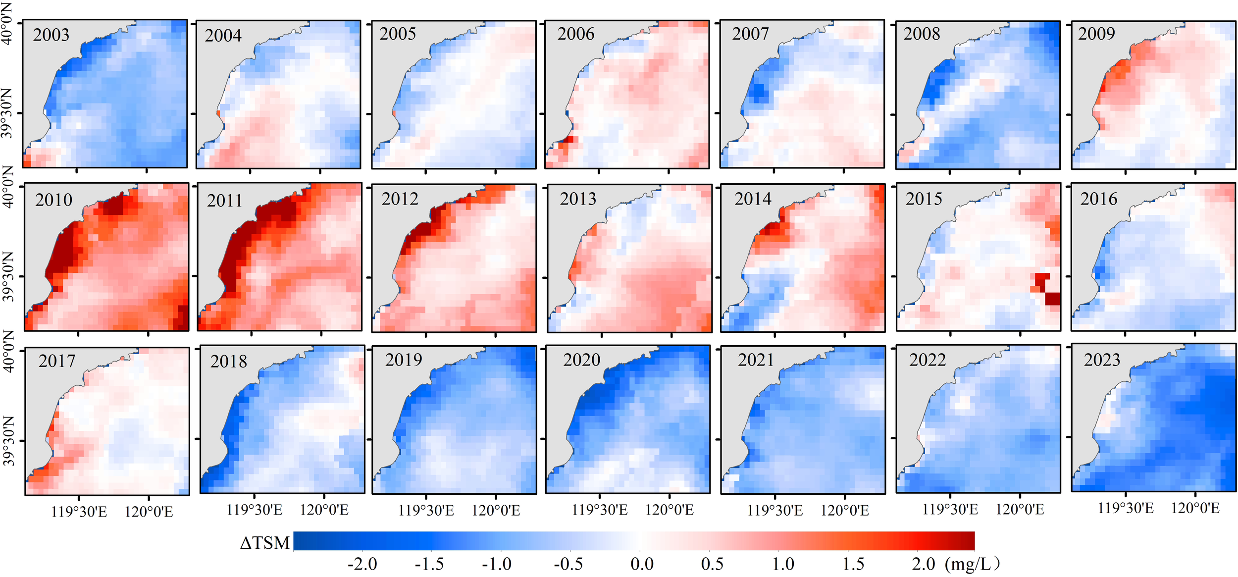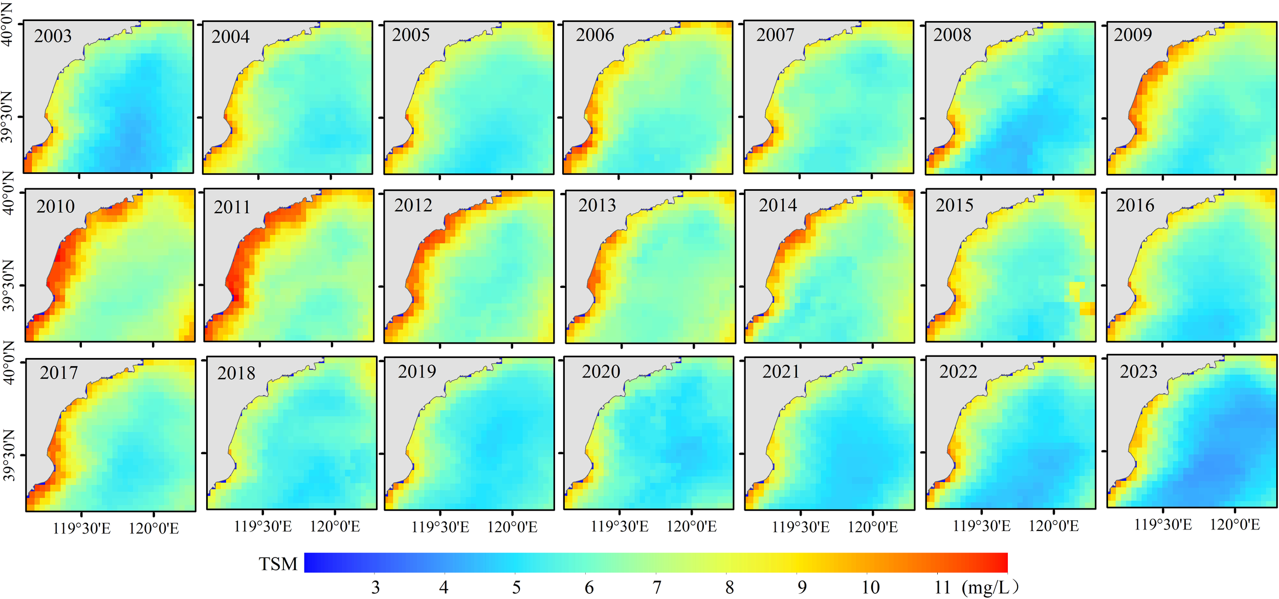 Suspended matter serves as an essential carrier for pollutants in water, including nutrients and heavy metals, which significantly impacts water transparency, the underwater light field, and primary productivity (Shi et al., 2015). Consequently, suspended matter has become an important indicator for water quality monitoring and assessment. In recent years, remote sensing technology has emerged as a pivotal means for monitoring the marine ecological environment, and the types and accuracy of these monitoring products have been continuously improved (Jiang et al., 2019). Remote sensing monitoring of TSM has been in practice for many years, and the technology is relatively mature. However, the varying optical properties of waters across different seas result in the retrieval model exhibits distinct regional characteristics.