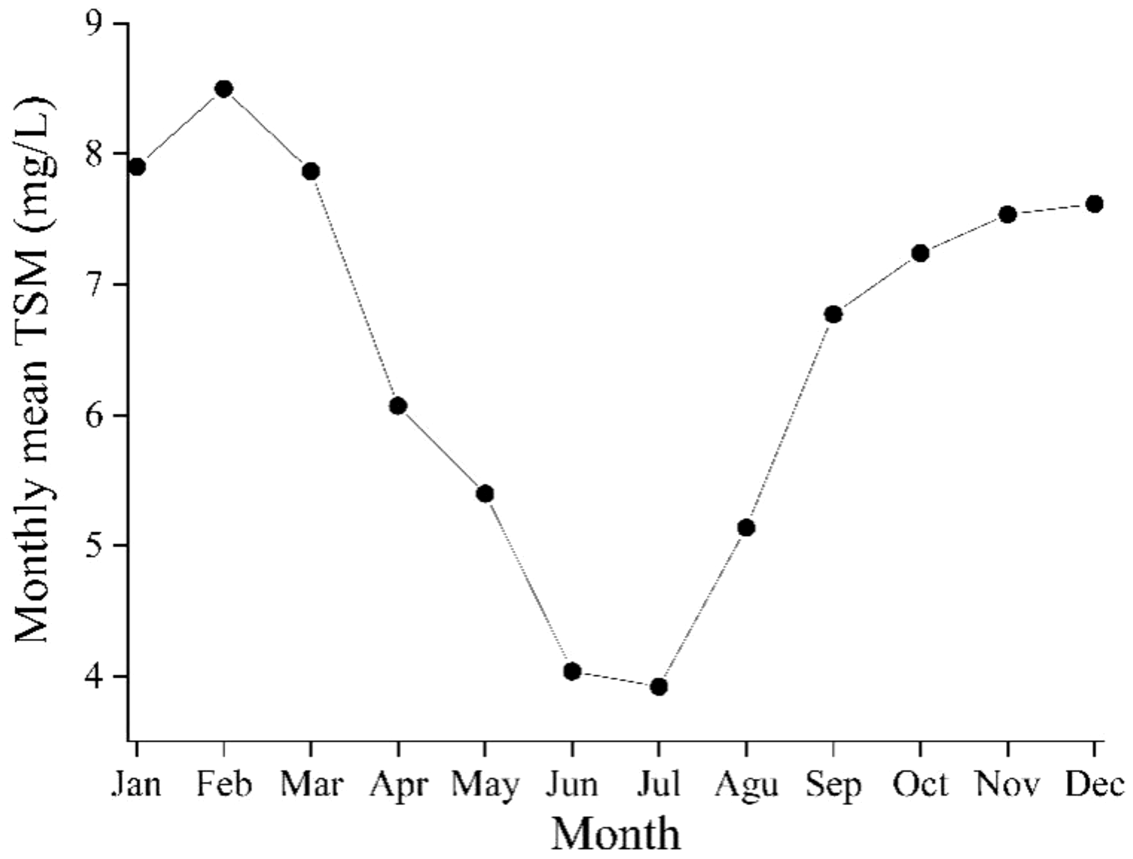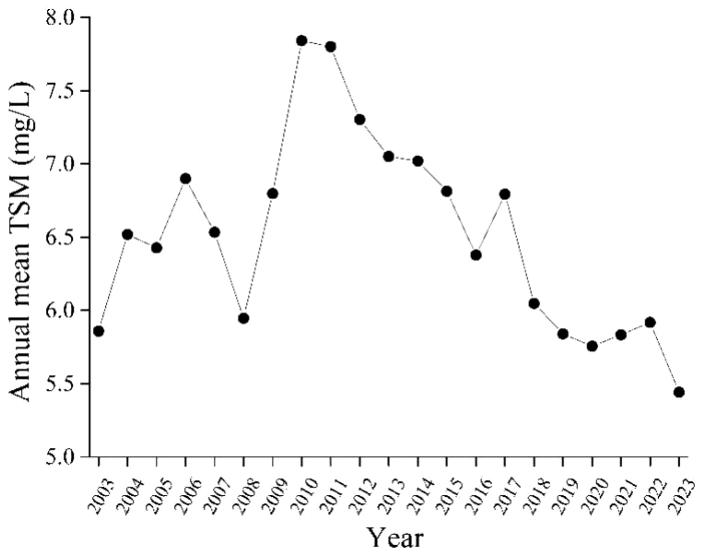 Aqua MODIS satellite data were downloaded from NASA’s open access Earth science data collections (https://www.earthdata.nasa.gov/). The daily Level 2 Aqua MODIS data for 31 August 2013, 1 June 2016, 19 and 20 September 2017 were used to validate the accuracy of TSM derived from Aqua MODIS data, and the monthly and annual Level 3 data from 2003 to 2023 were used to characterize the spatiotemporal variation of TSM in this study.