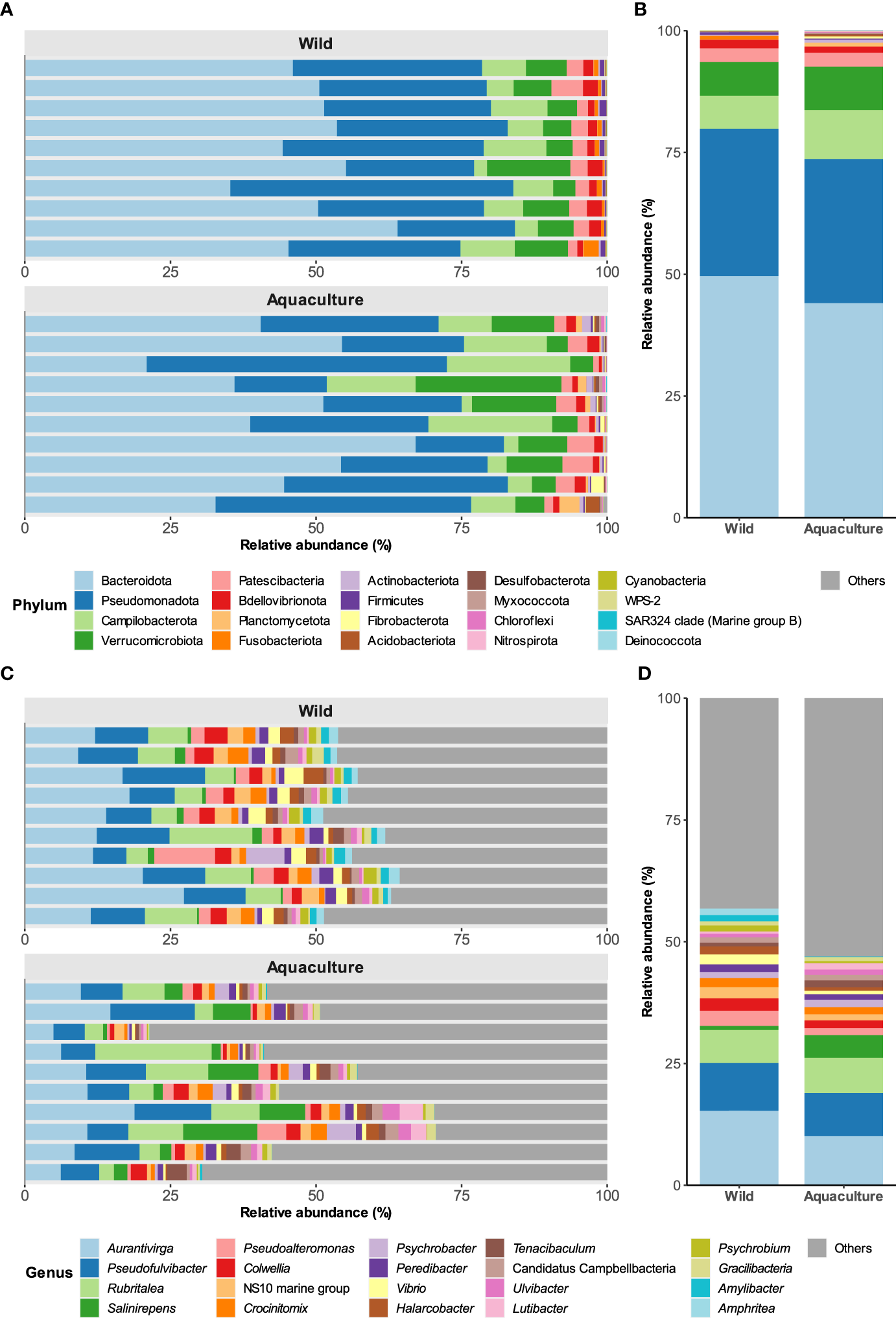 Taxonomic composition of bacterial populations in the skin of wild and aquaculture octopuses. (A) Comparation of the relative abundances of the 20 most prevalent phyla (x-axis) found in the mucosal skin microbiome of both wild and aquaculture octopuses. (B) Mean relative abundances of these phyla across all samples. (C, D) depict the taxonomic composition at the genus level.