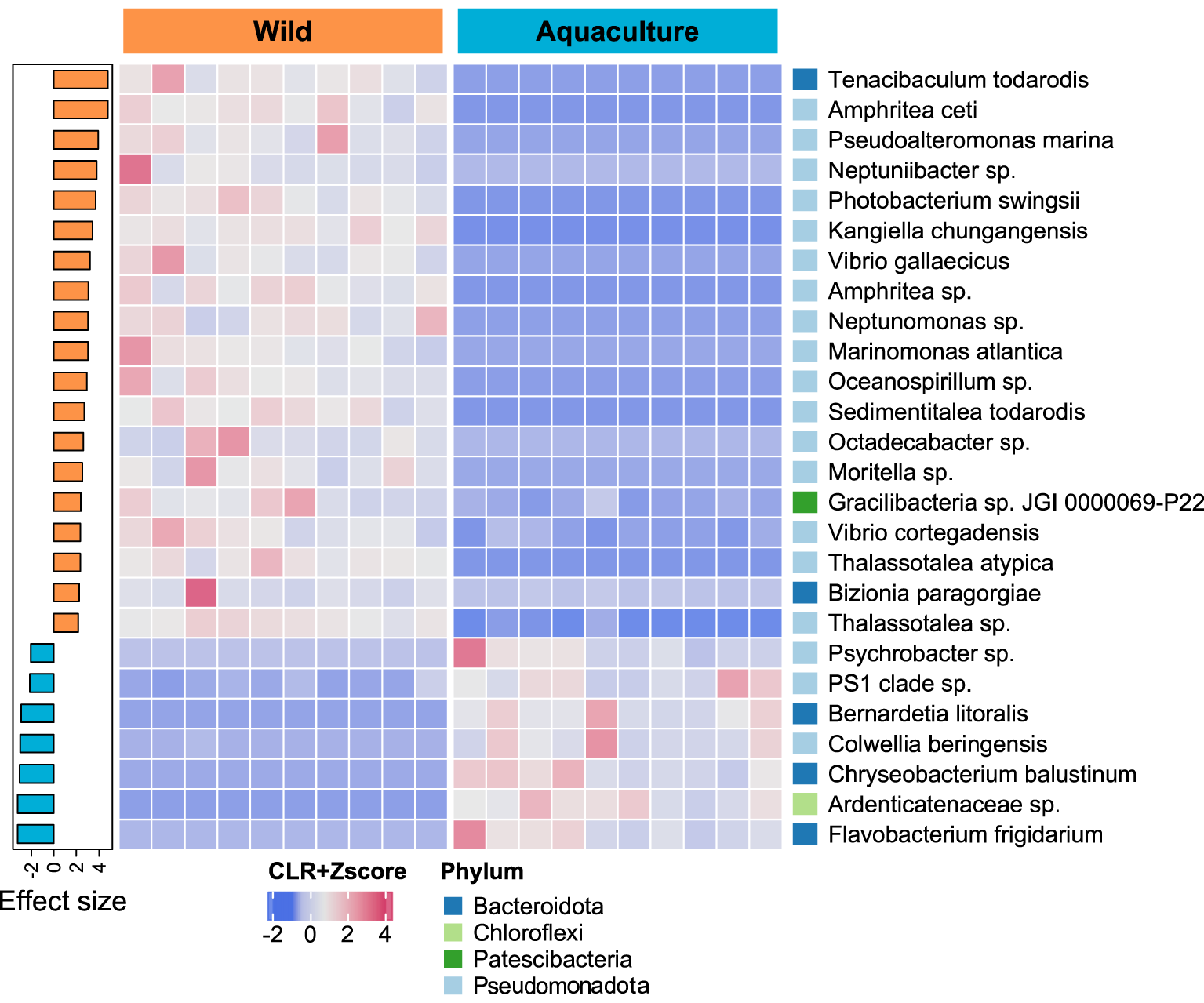Comparation of abundant species between wild and aquaculture octopuses. The heatmap’s colors represent the scale-transformed relative abundance of 26 bacterial species identified as significantly differentially abundant (FDR adjusted p ≤ 0.05 and |effect size| ≥ 2.0). The sample columns are hierarchically clustered, and the bacterial species are ordered by decreasing effect size, as seen in the sidebar plot on the right. The phyla to which each species belongs are also shown on the right sidebar.