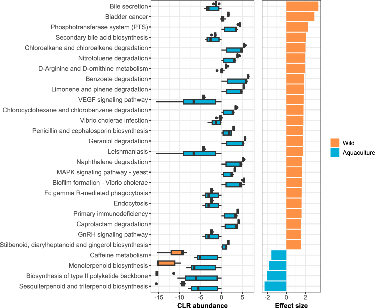 Predicted functional gene profiles. The left panel shows the boxplots of CLR abundances for the 28 PICRUSt2-predicted KEGG pathways identified as differentially abundant between wild and aquaculture groups by ALDEx2 analysis (FDR adjusted p ≤ 0.05 and |effect size| ≥ 1.5). Pathways are ordered by descending effect size, shown in the right panel of the graph.