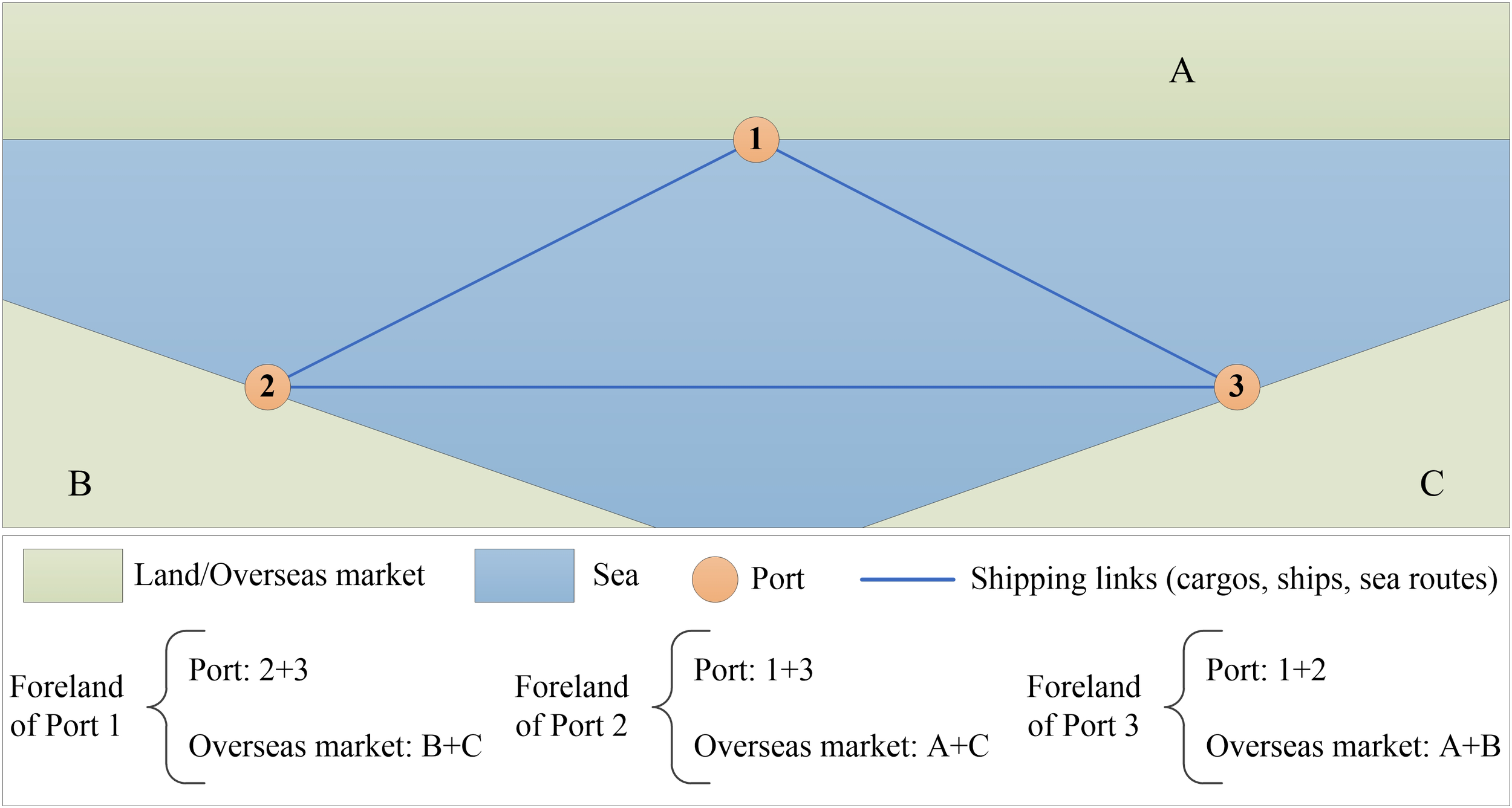 The foreland can be regarded as the mirror of the hinterland, that is, the area (port and overseas market) where the port is connected by shipping (Weigend, 1958; Zohil and Prijon, 1999; Rodrigue, 2010; Jafari and Khosheghbal, 2013) (Figure 1). According to the connotation, foreland is related to the foreland network, in which the number of sea routes connected with the port node or the freight volume on each sea route will affect the vastness of the port foreland (Wang and Zhang, 2014). It can be considered that the evolution of port foreland is directly related to the foreland network. Containerisation in maritime transportation has promoted the strong and direct integration of port supply chains; increasing attention has been paid to the maritime spatial connection beyond the port back to the inland. The importance of the port foreland has become increasingly prominent. Foreland-based regionalisation can support export-oriented strategies with better connectivity of more marginal (or in their early stage of growth) ports to global shipping networks (Rodrigue and Notteboom, 2010). Improved foreland port connectivity helps reduce maritime transport costs, enable the integration of regional economies into the international transport network and facilitate bilateral trade (Martínez-Moya and Feo-Valero, 2020).