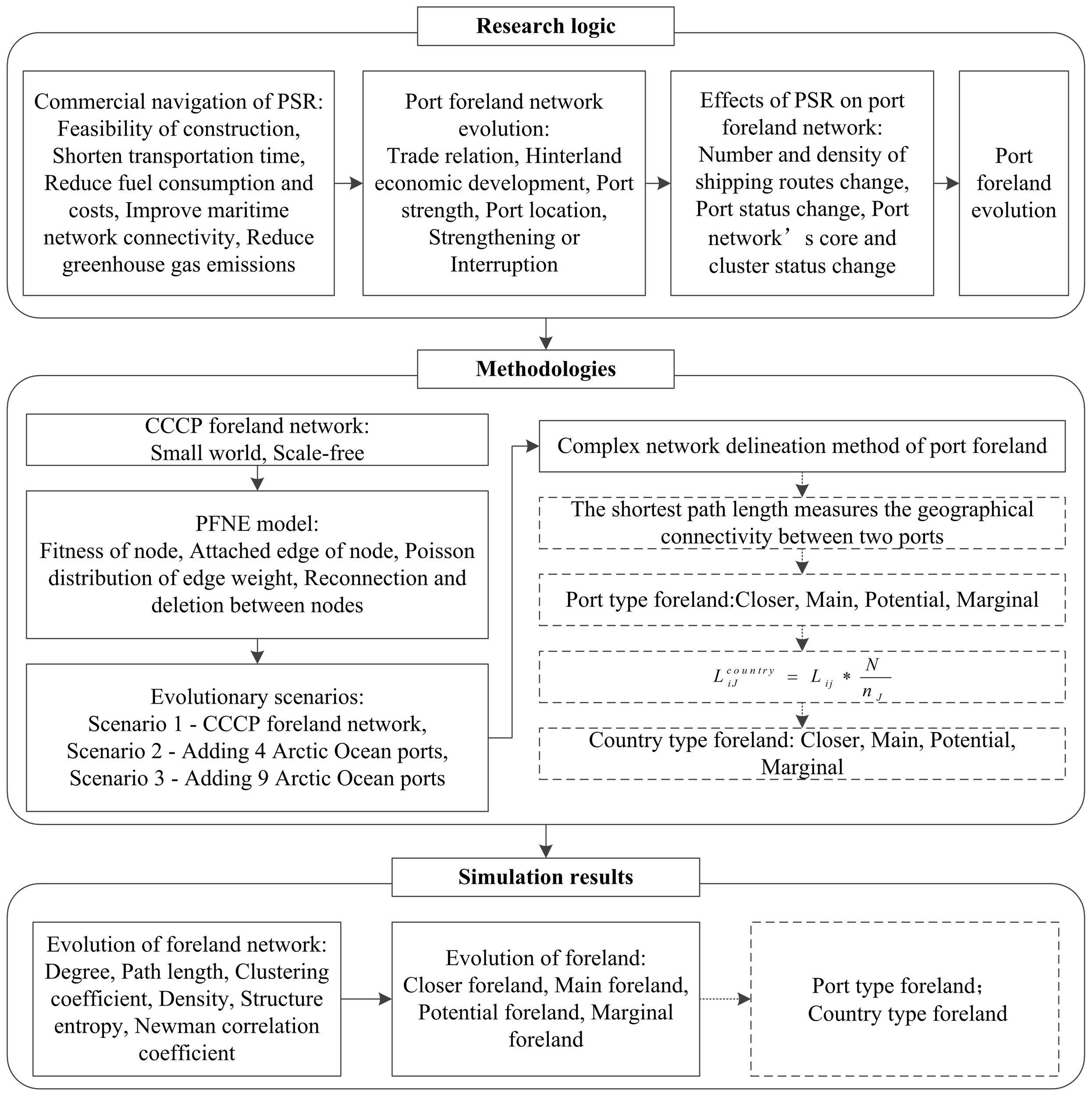Thus, this study bridges the research gaps mentioned above. Firstly, we simulate the potential effects of PSR on the foreland evolution of CCCP. This study is a preliminary attempt to consider the effects of PSR on port foreland, and it helps predict the development trend of the port and shipping market in advance and enable measures to be taken to adapt to the changing market environment. Secondly, given that the port foreland network is the foundation of foreland delineation, a complex network delineation method of port foreland, which expands the quantitative methods in the foreland and facilitates the discovery of different overseas markets’ importance. is proposed. Finally, we construct the PFNE model, which is closer to the generation law and evolution of the real foreland network compared with other models.