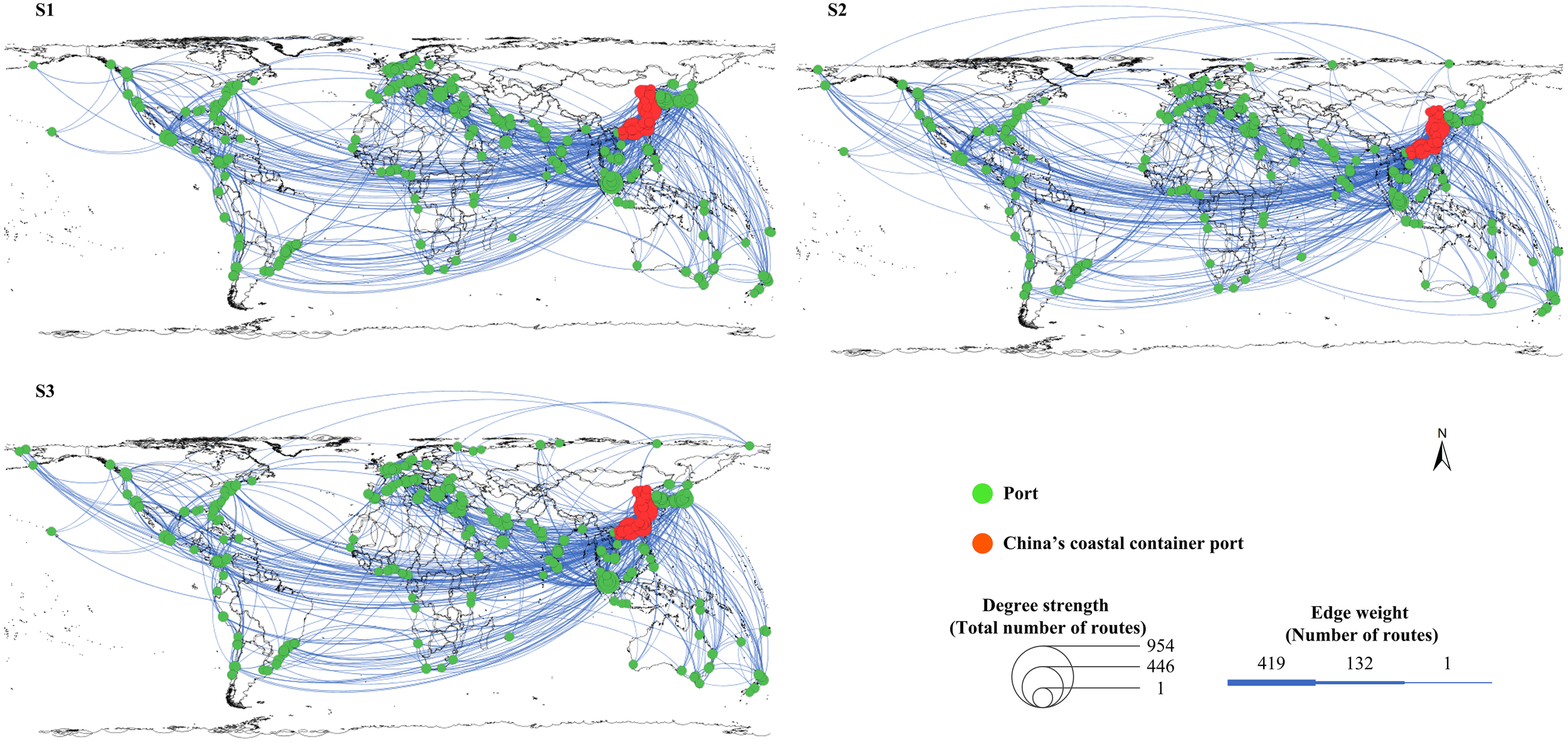 In network analysis, degree strength is defined as the relative position of a given port regarding other ports in the foreland network (Ducruet et al., 2010). Degree strength is defined by Equation 3 (Freeman, 1979), where Sidenotes the strength of port i: