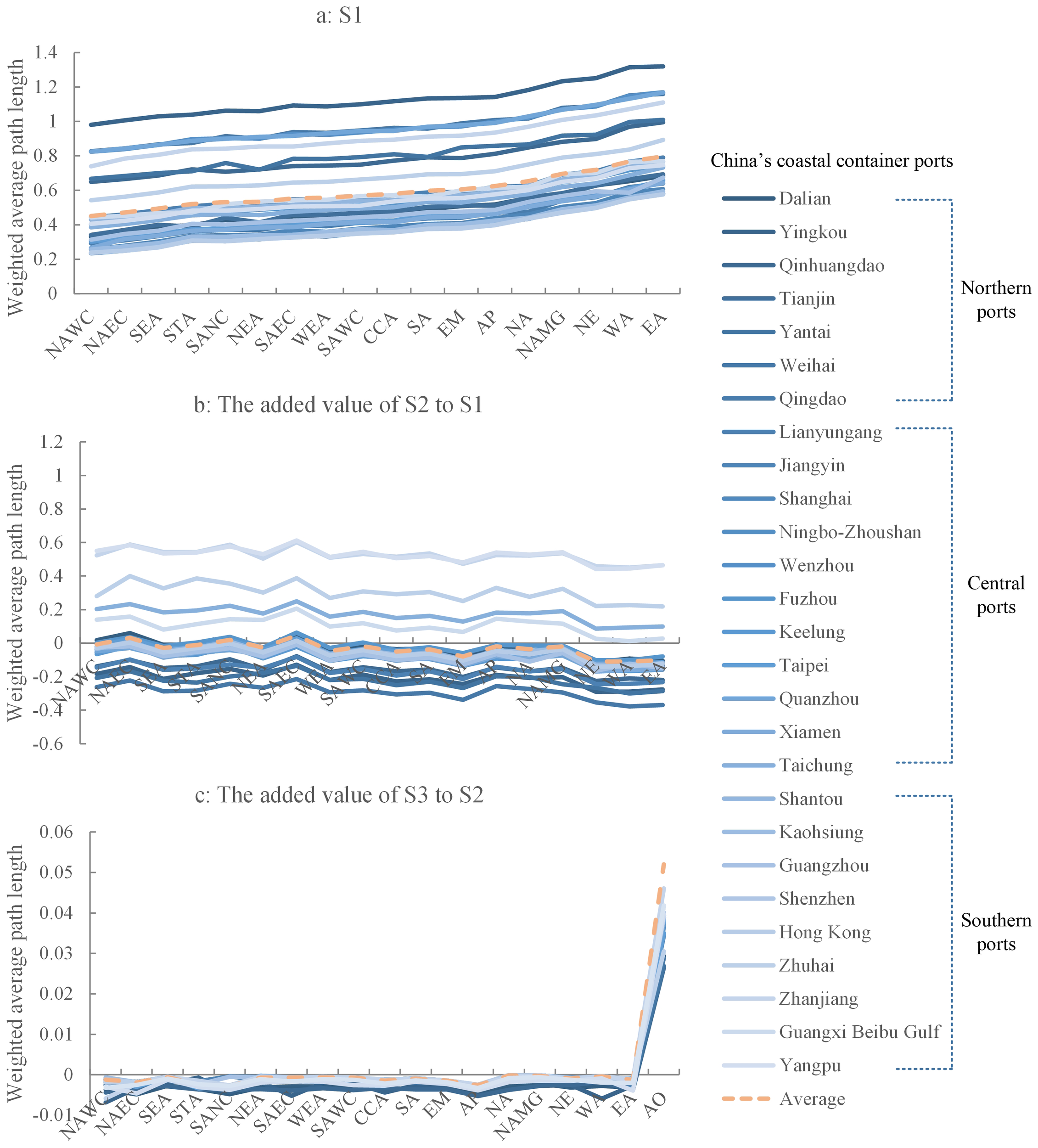 where is the shortest country path length between port i and country J, is the average path length between port i and all ports in country J, N is the total ports’ number except the port of the country where port i is located, and nJ is the number of ports in country J.