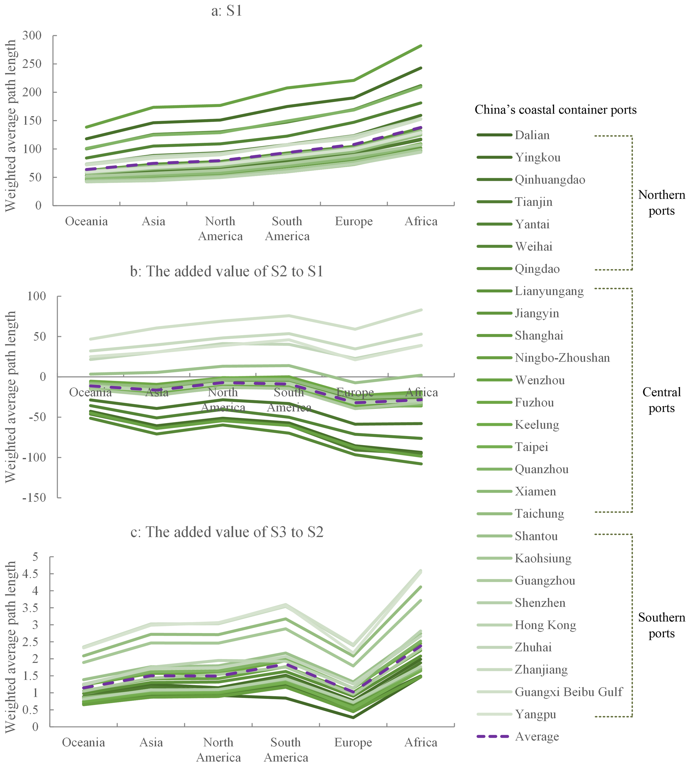 Scenario 3 (S3): Port construction, especially along the Arctic Ocean, is important work in the PSR’s development. With the continuous improvement of the PSR’s navigation capacity, the Arkhangelsk, Provideniya, Dikson, Pevek and Mezen ports in the Arctic Ocean region have good development prospects and will be added to the CCCP foreland network.