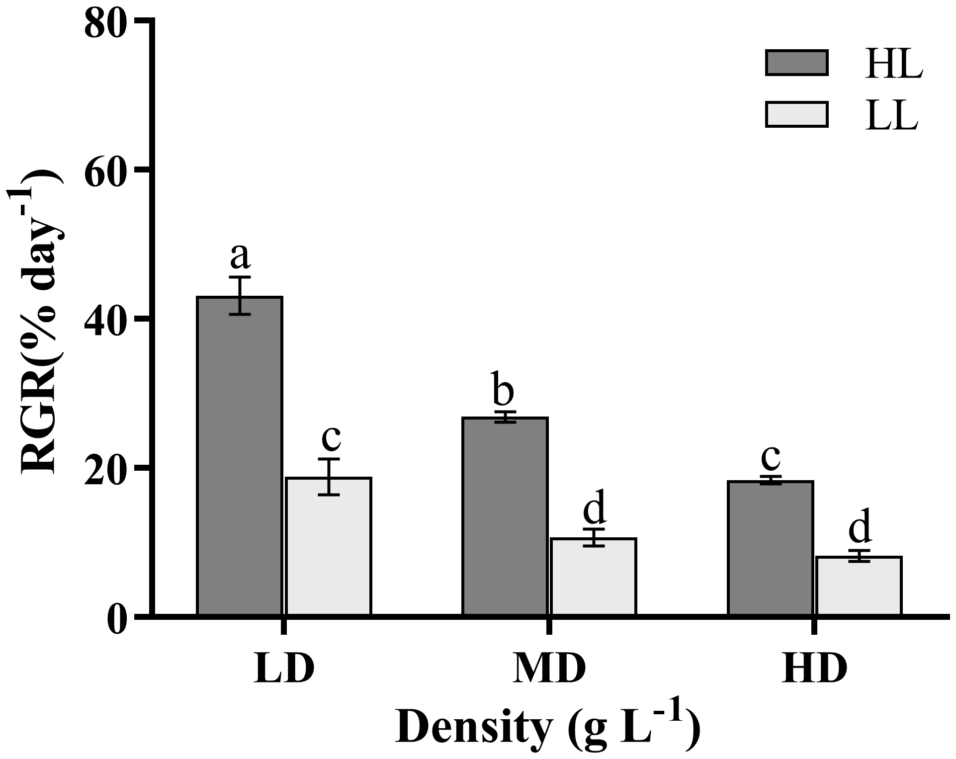 The relative growth rate (RGR) of U. linza grown under three stocking densities (LD: 0.2 g L-1; MD: 1 g L-1; HD: 2 g L-1) and tow light intensities(LL: 80 μmol photons m-2 s-1; HL: 300 μmol photons m-2 s-1)treatments. Data are reported as means ± SD (n = 3). Different lowercase letters above the error bars represent significant differences between the treatments (P< 0.05).