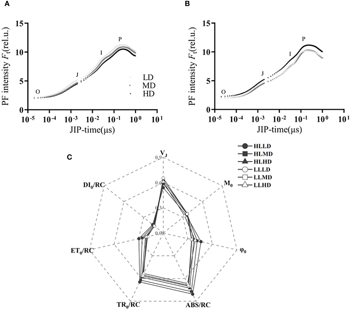 OJIP curves of U. linza grown under LL treatment (A), HL treatment (B). And the energy absorbed per unit reaction center (ABS/RC), the energy dissipated per unit reaction center (DI0/RC), the energy captured per unit reaction center for the reduction of QA (TR0/RC), the energy captured per unit reaction center for electron transfer (ET0/RC), relative variable fluorescence (VJ), initial slope of the OJIP fluorescence induction curve (M0), and the degree of opening of active reaction centers (Ψ0) of U. linza grown under different treatments (C) (HLLD: 300 μmol photons m-2 s-1, 0.2 g L-1; HLMD: 300 μmol photons m-2 s-1, 1 g L-1; HLHD: 300 μmol photons m-2 s-1, 2 g L-1; LLLD: 80 μmol photons m-2 s-1, 0.2 g L-1; LLMD: 80 μmol photons m-2 s-1, 1 g L-1; LLHD: 80 μmol photons m-2 s-1, 2 g L-1).