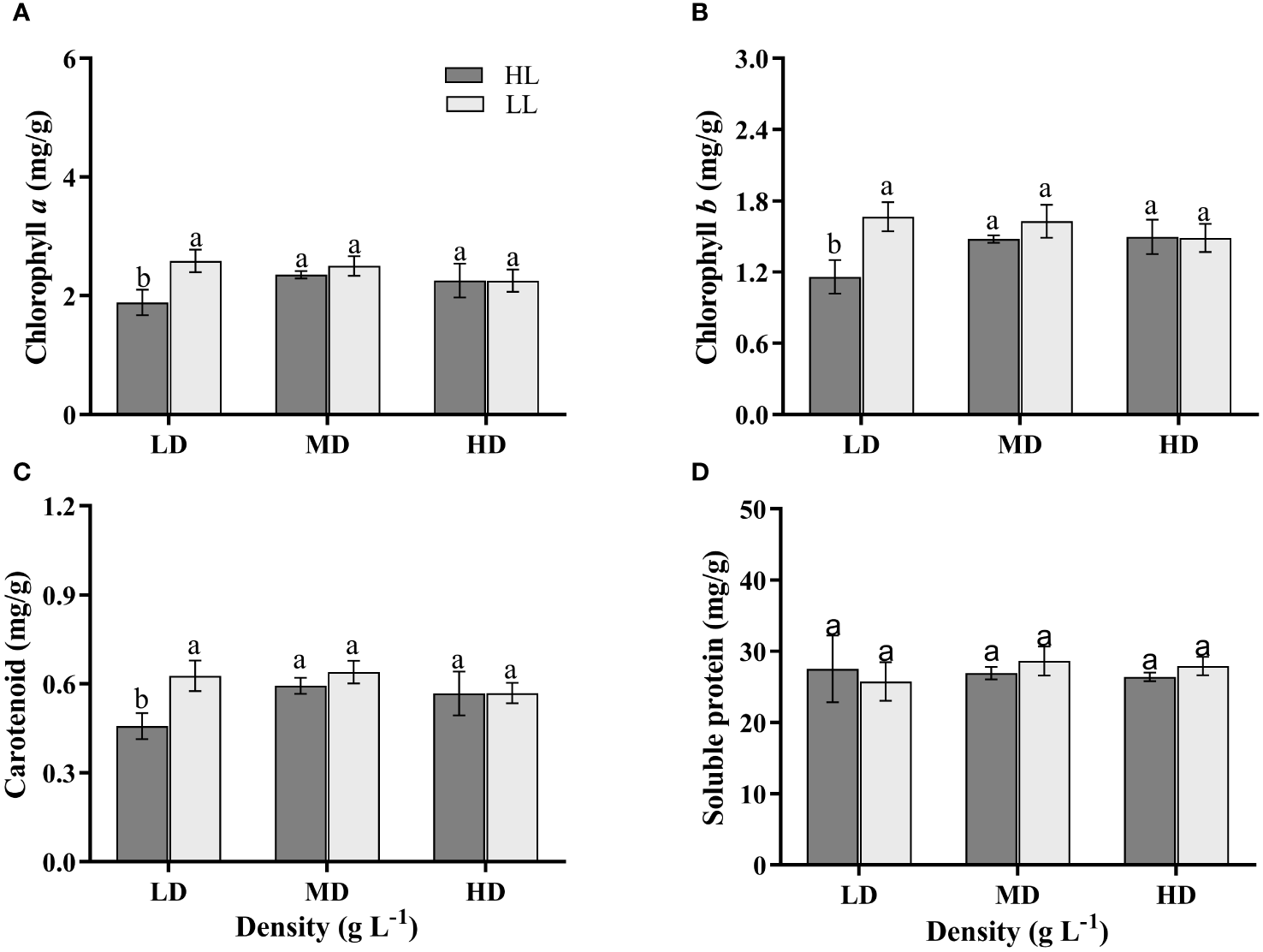 The Chlorophyll a(A), Chlorophyll b(B), Carotenoid (C) and Soluble protein (D) contents of U. linza grown under different treatments (LD: 0.2 g L-1; MD: 1 g L-1; HD: 2 g L-1; LL: 80 μmol photons m-2 s-1; HL: 300 μmol photons m-2 s-1). Data are reported as means ± SD (n = 3). Different lowercase letters above the error bars represent significant differences between the treatments (P< 0.05).