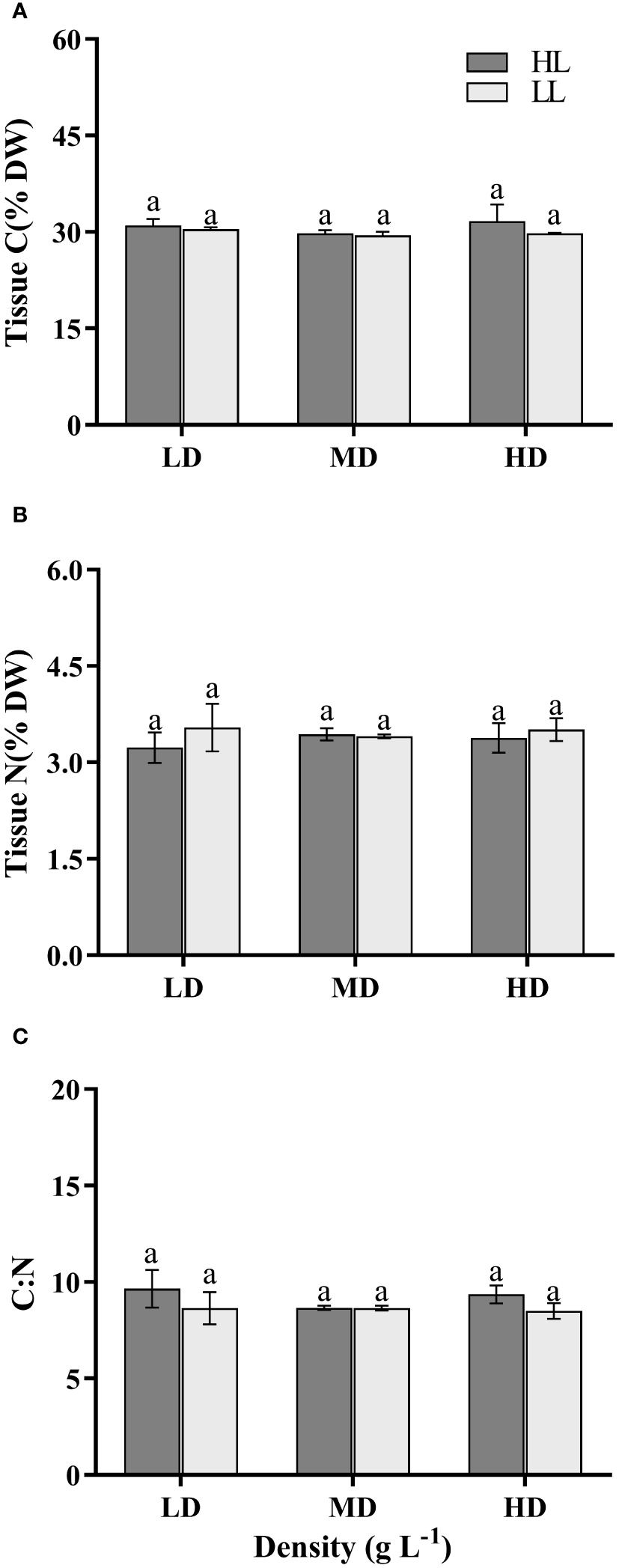 Tissue carbon (A), nitrogen (B) and C:N ratio (C) of U. linza grown under different treatments (LD: 0.2 g L-1; MD: 1 g L-1; HD: 2 g L-1; LL: 80 μmol photons m-2 s-1; HL: 300 μmol photons m-2 s-1). Data are reported as means ± SD (n = 3). Different lowercase letters above the error bars represent significant differences between the treatments (P< 0.05).