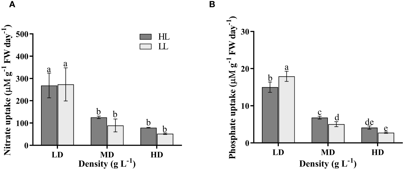N uptake rate (A) and P uptake rate (B) of U. linza grown under different treatments (LD: 0.2 g L-1; MD: 1 g L-1; HD: 2 g L-1; LL: 80 μmol photons m-2 s-1; HL: 300 μmol photons m-2 s-1). Data are reported as means ± SD (n = 3). Different lowercase letters above the error bars represent significant differences between the treatments (P< 0.05).