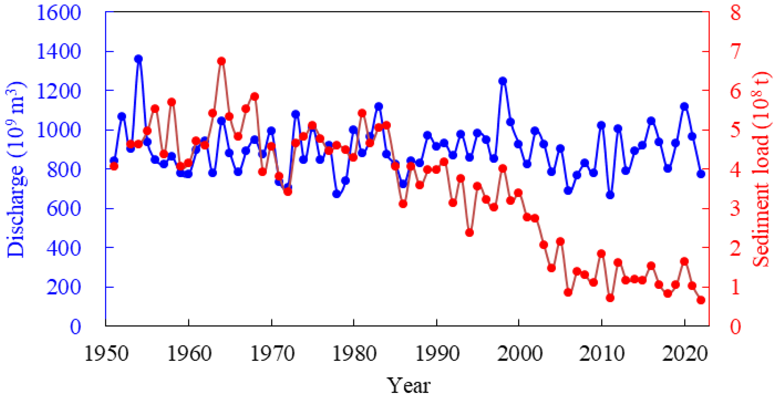 Temporal variations of annual water and sediment discharges at Datong station during 1951 -2022 (data from the Changjiang River Hydraulic Engineering Committee).