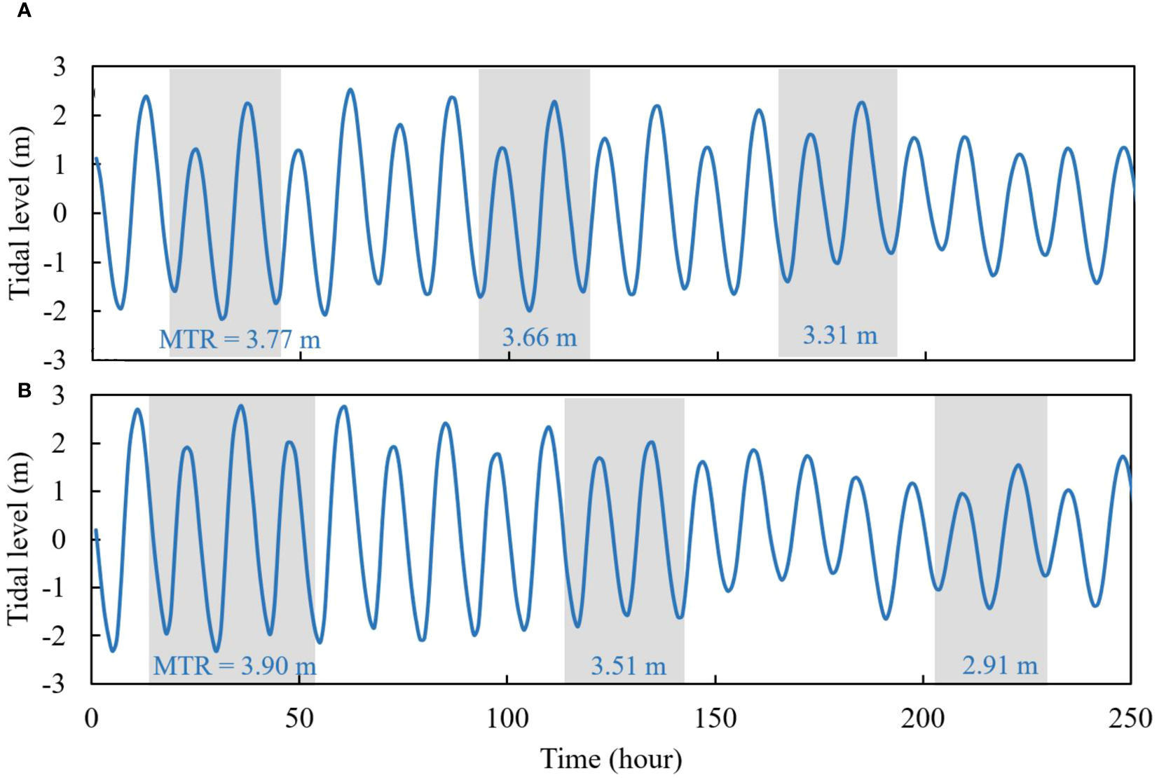 Tidal series of the tidal level and the mean tidal range (MTR) at Luchaogang gauging station during the 2023 (A) and 2014 (B) cruises. The shades denote the periods of hydrographic surveys.