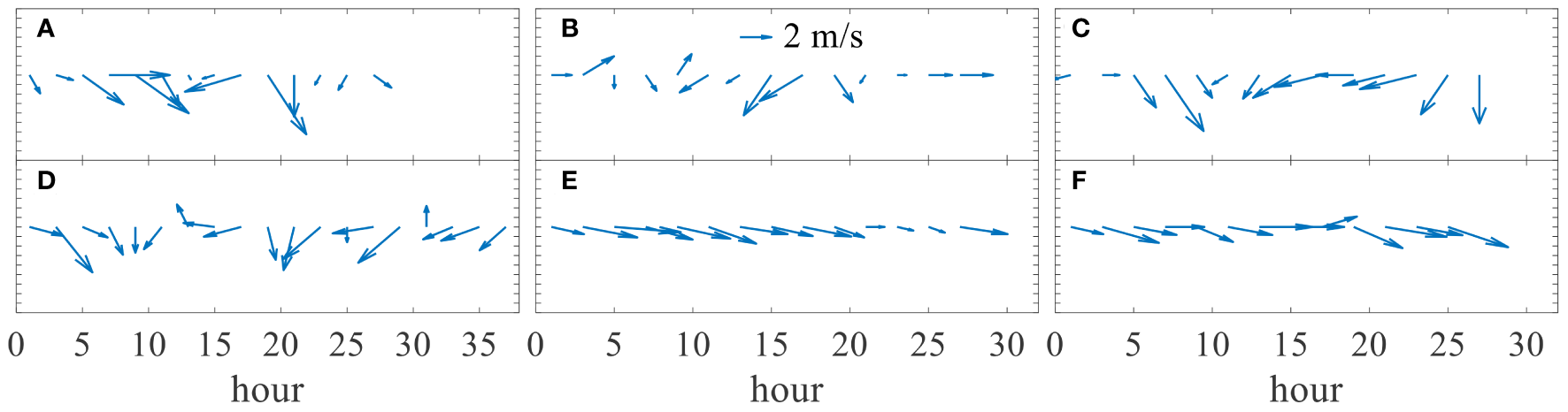 Time series of wind vectors during the spring (A), intermediate (B) and Neap (C) tides of the 2023 cruise and the spring (D), intermediate (E) and neap (F) tides of the 2014 cruise.