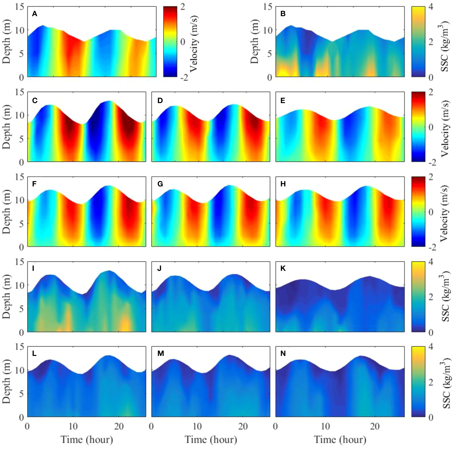 Time series of current velocity and SSC profiles at HZW station. (A, B) velocity and SSC in during the 1983 cruise; (C–E) and (F–H) are velocity during spring, intermediate and neap tides during the 2014 and 2023 cruises, respectively; (I–K) and (L–N) are SSC during spring, intermediate and neap tides during the 2014 and 2023 cruises, respectively.