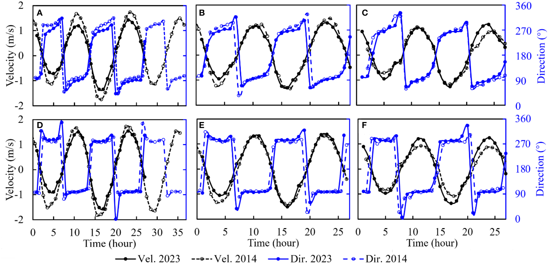 Figures 6 , 7 illustrate the time series of the vertical profile of current velocity and SSC at LCG and HZW stations in the 2023, 2014 and 1983 cruises, respectively. Figure 8 shows the time series of depth - averaged current velocities and directions at the two stations during the spring, intermediate and neap tides of 2023 and 2014. Both stations were dominated by rectilinear currents. At LCG, the current directions ranged from 250° to 340° during the flood tides and from 50° to 150° during ebb tides. At HZW it ranged from 280° to 320° during the flood tides and 85° to 115° during ebb tides. The directions of the flood and ebb velocities at LCG station deviated southward by about 20° from 2014 to 2023, probably due to the change in the local coastline which would be discussed later. No significant changes occurred in the directions of the current velocities at HZW station.