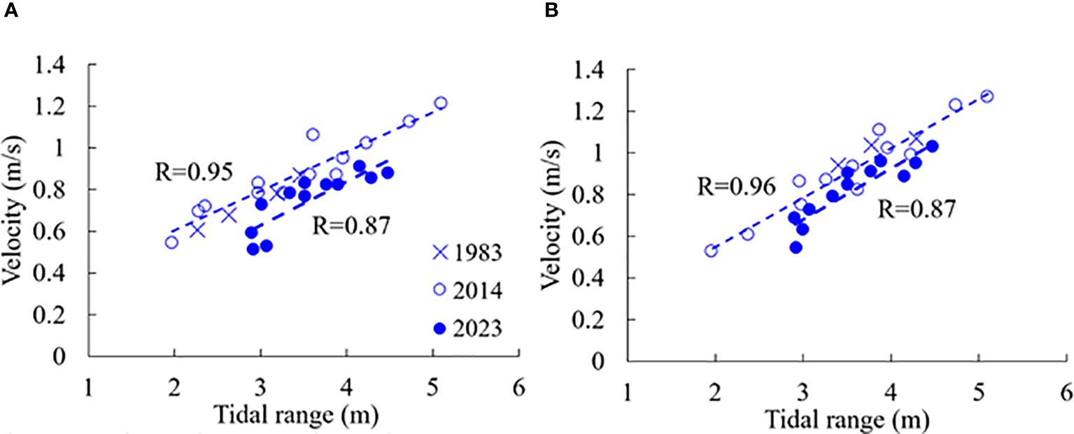 The correlations between flood or ebb - averaged current velocity at LCG (A) and HZW (B) stations and the corresponding tidal ranges during the cruises of 1983, 2014 and 2023.