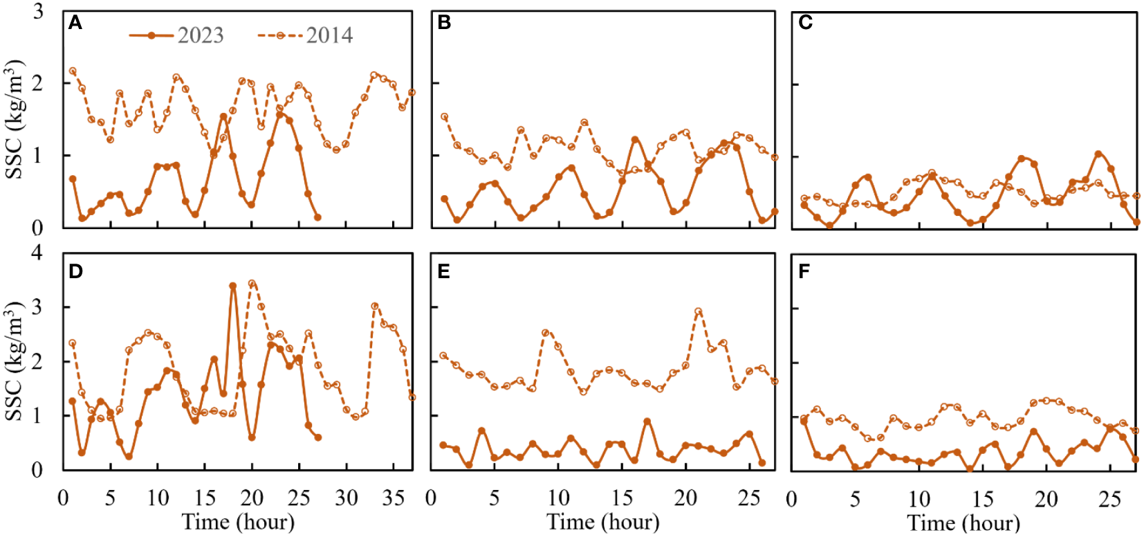 Time series of depth - averaged SSC at LCG station during spring (A), intermediate (B) and neap (C) tides of the 2023 and 2014 cruises; and at HZW station during spring (D), intermediate (E) and neap (F) tides of the 2023 and 2014 cruises.
