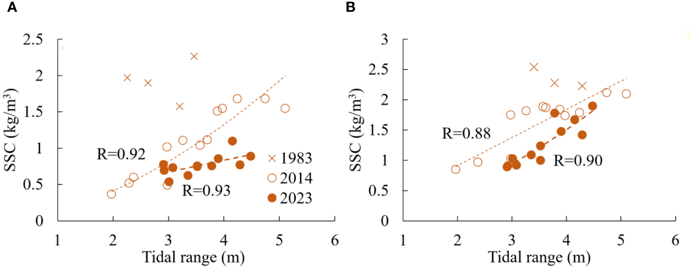 The correlations between flood or ebb - averaged SSC at LCG (A) and HZW (B) and the corresponding tidal ranges during the cruises of 1983, 2014 and 2023.