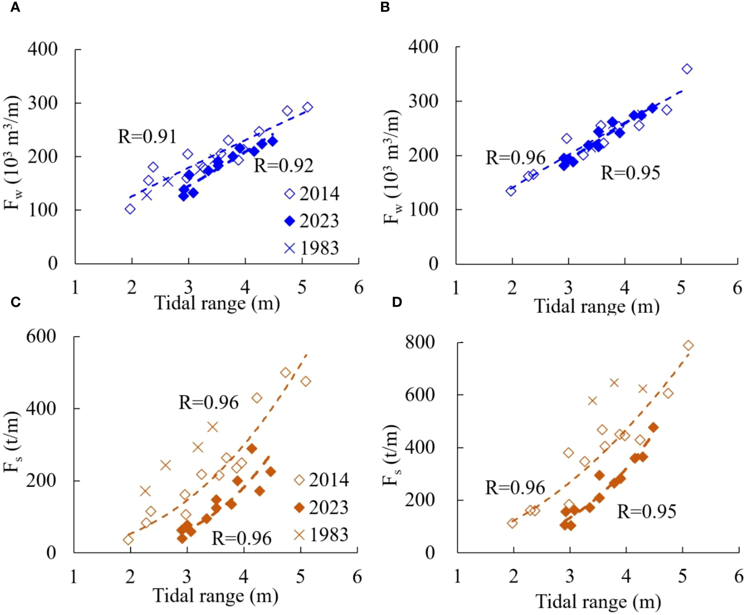 The correlations between flood or ebb - averaged water (A, B) and sediment (C, D) fluxes at LCG and HZW and the corresponding tidal ranges during the cruises of 1983, 2014 and 2023.