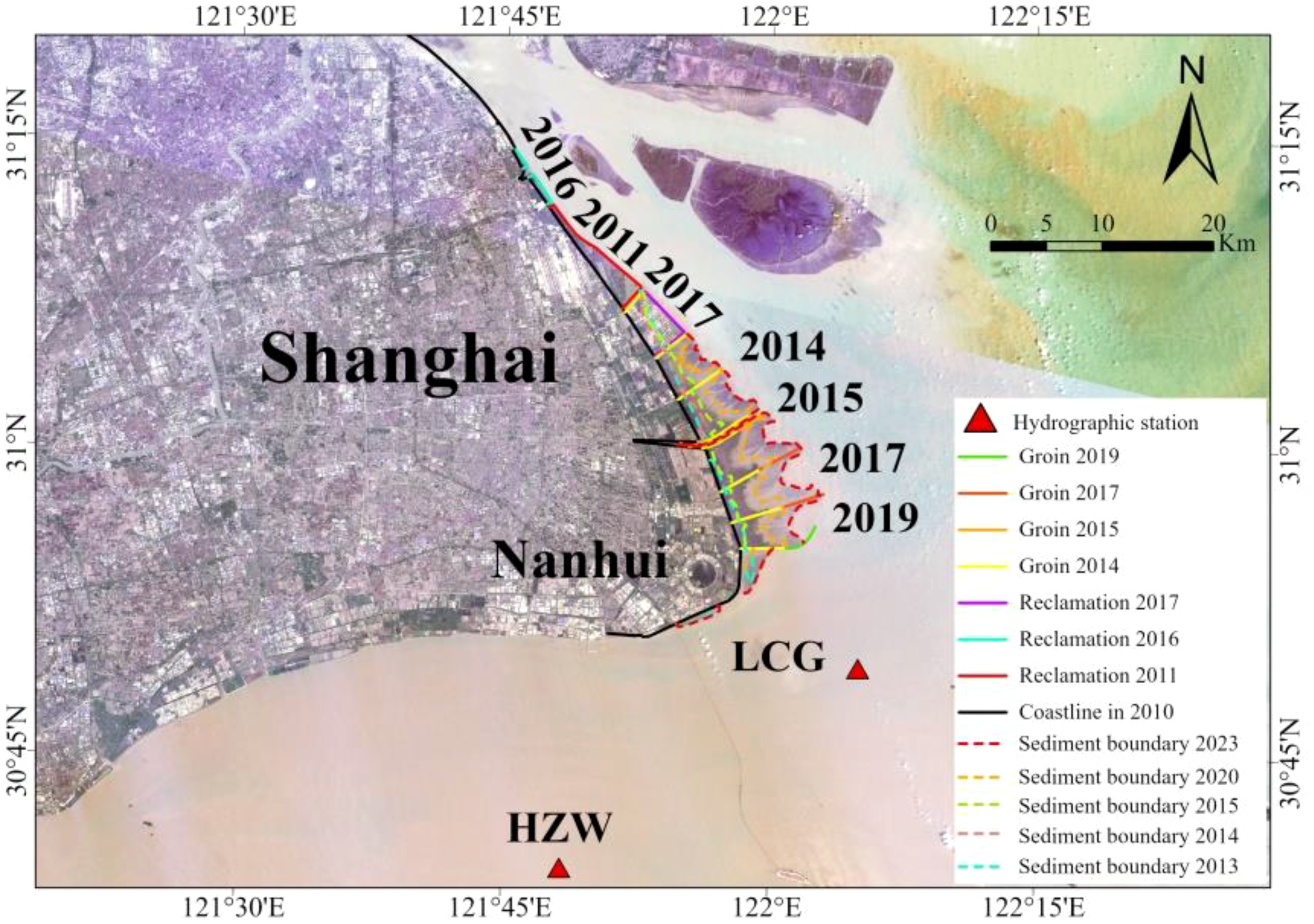 The recent evolution of the Changjiang Estuary and Hangzhou Bay has suffered drastic changes from intensive artificial interferences in Changjiang river catchment and within the Changjiang Estuary. The operation of the Three Gorges Dam in 2003 has significantly decreased Changjiang riverine sediment by up to 70% (Yang et al., 2011). In addition, the Changjiang Estuary has also been largely influenced by estuarine reclamation projects for the urban expansion of Shanghai. More than 1200 km2 of land has been reclaimed from 1950 to 2010 (Wei et al., 2017) and about 202 km2 of land was reclaimed within the Nanhui flat from 1958 to 2013 (Wei et al., 2019).