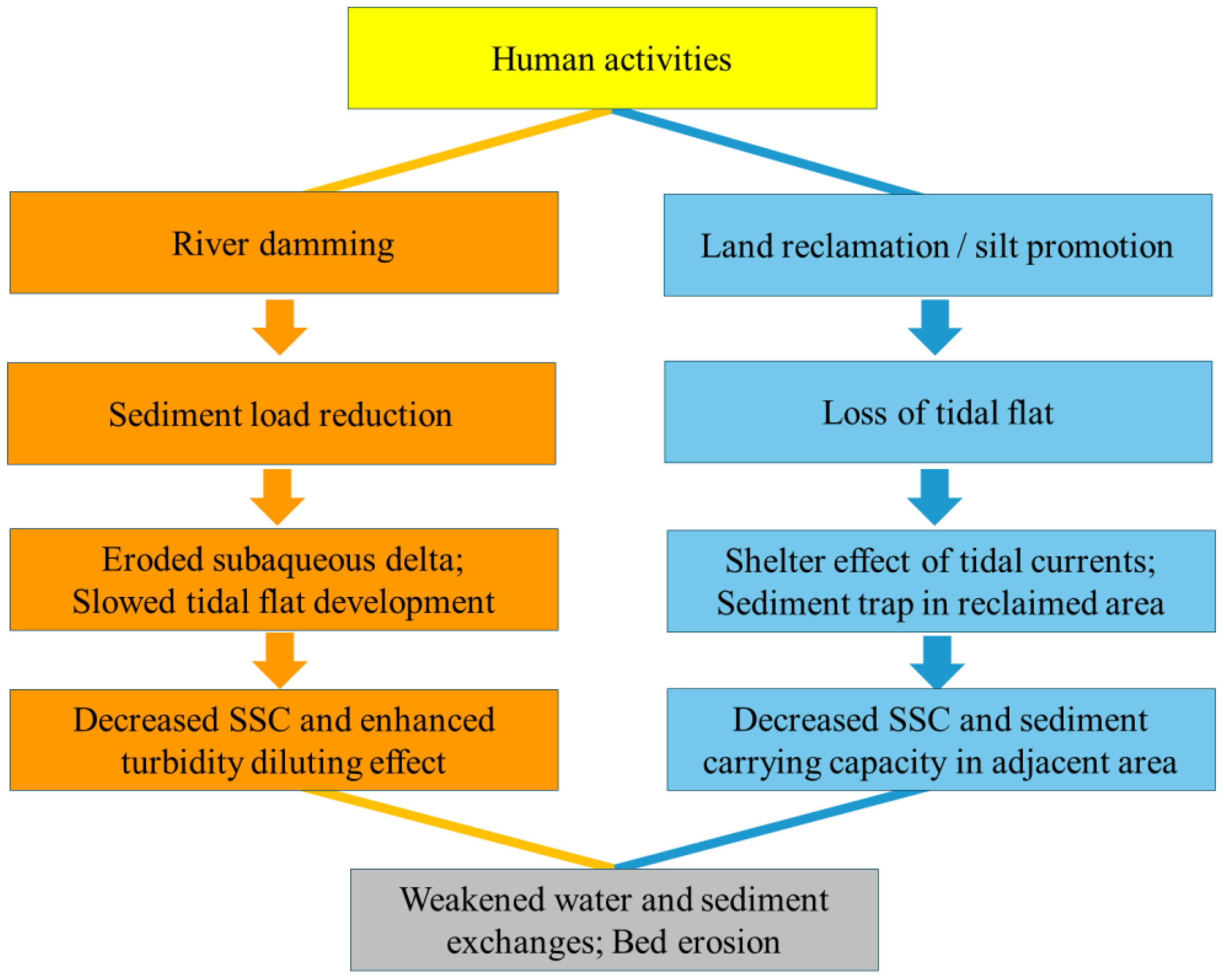 This study provided the direct evidence on how the decrease in sediment load and land reclamation affect the sediment budget in this region. Despite the meaningful exploration in this study, it is difficult to completely distinguish the impacts of local land reclamation, the riverine sediment load reduction and associated morphological evolutions. It would be helpful to conduct process - based morphodynamic modelling, remote sensing analysis from high resolution images, and even long - time monitoring using hydrographical measurements in future.