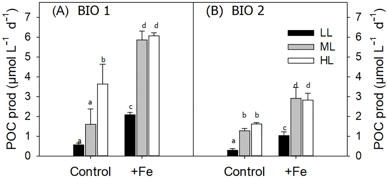 Daily particulate organic carbon (POC) production rates of the phytoplankton communities sampled at stations BIO 1 (A) and BIO 2 (B) after growing them at low light (LL; 30 µmol photons m−2 s−1), middle light (ML; 80 µmol photons m−2 s−1), and high light (HL; 150 µmol photons m−2 s−1) in conjunction with in situ iron concentrations (Control) or after iron addition (+Fe). Values represent the means (± SD) of triplicate incubations. Significant differences between treatments are indicated by varying lowercase letters (post-hoc tests, p < 0.05).