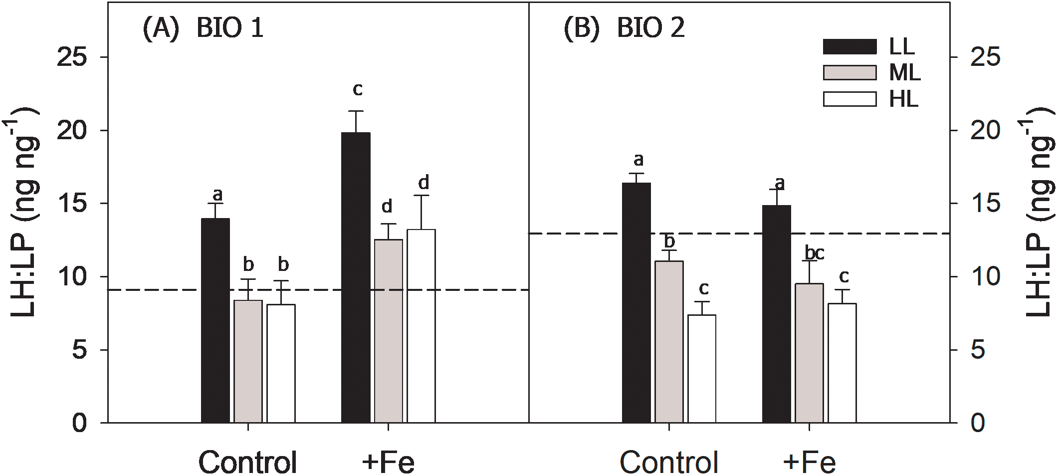 | Bio 1 | +Fe | LL | 0.43 ± 0.01b | 2.5 ± 0.08ab | 0.41 ± 0.01c | 610 ± 19ac | 134 ± 4ac | 70 ± 6a | 1.93 ± 0.14a |