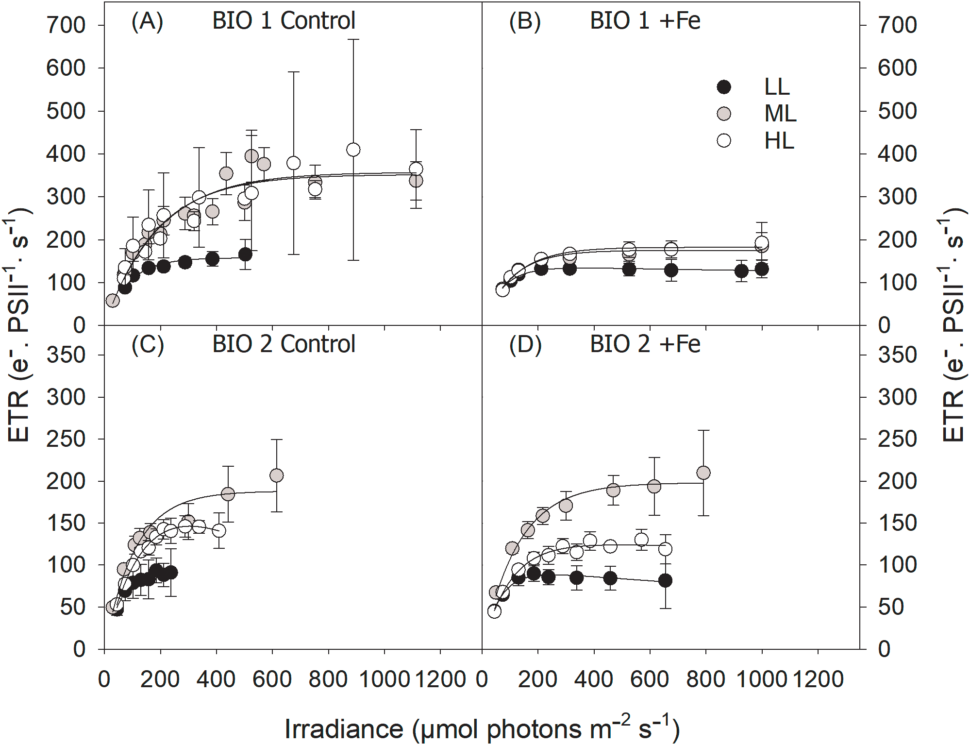 The dark-adapted maximum photosystem II quantum yield (Fv/Fm), the functional absorption cross-section of PSII (σPSII), energy transfer between photosystem II units (connectivity, P), re-oxidation times of the primary electron acceptor Qa (τQa), maximum electron transport rates (ETRmax), minimum saturating irradiance (Ik), and the maximum light utilization efficiency (α) of the natural phytoplankton communities sampled in BIO 1 and BIO 2 stations after growing them at low light (LL; 30 µmol photons m−2 s−1), middle light (ML; 80 µmol photons m−2 s−1), and high light (HL; 150 µmol photons m−2 s−1) under in situ iron concentrations (Con) and after Fe addition (+Fe) conditions.