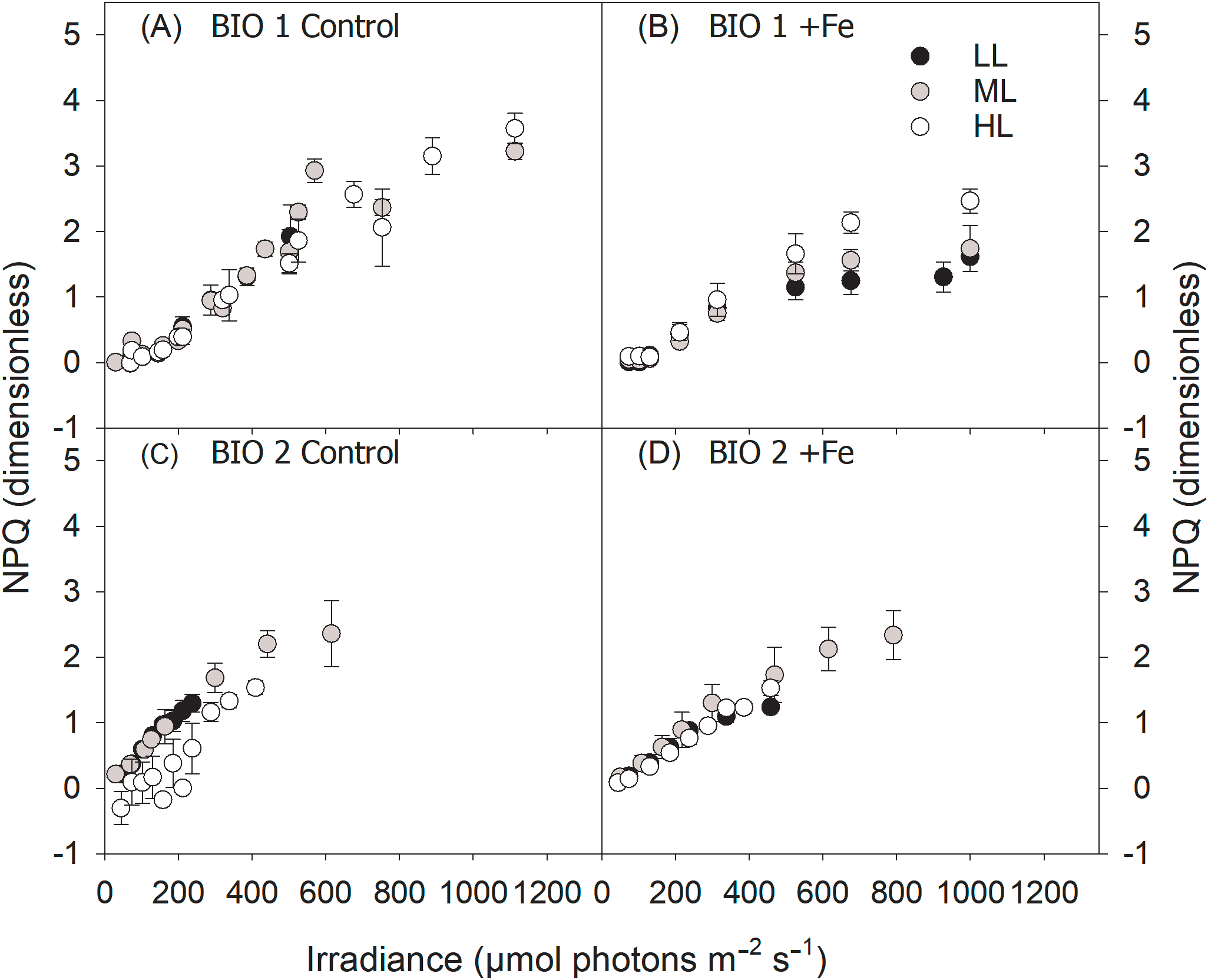 At the end of the experiment (Control, 11-day duration; +Fe, 10-day duration), POC production of the phytoplankton community sampled in BIO 1 was significantly influenced by Fe (p < 0.0001) and light alone (p < 0.0001) as well as their interaction (p < 0.0043) (Figure 1A; Table 3). Fe addition significantly increased POC production rates in all light treatments (Figure 1). For the Control treatments, POC production increased with increasing light intensity. In the +Fe treatments, POC production was strongly stimulated between LL and ML, while no further stimulation was observed between ML and HL (Figure 1). Looking at the POC-based growth rates (µPOC) of the BIO 1 assemblage, the ratio of µPOC in the Control (µPOCCon) to µPOC in the +Fe (µPOC+Fe) was similar between LL and ML and increased at HL (µPOCCon/µPOC+Fe; Table 4).