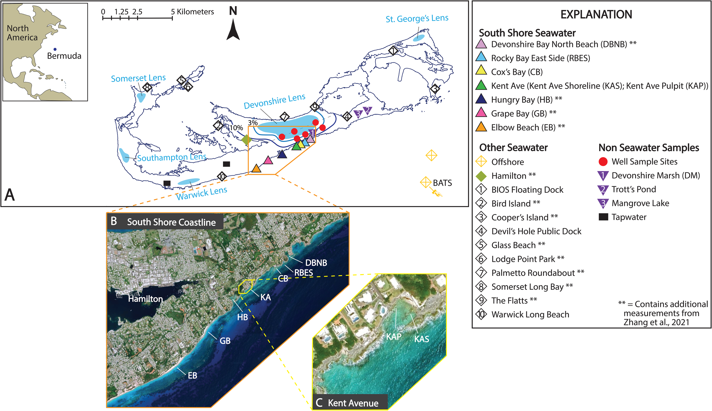 Individual samples were collected sporadically from a number of other sites (Cooper’s Island, Warwick Long Beach, Devil’s Hole within Harrington Sound, and a floating dock near the Bermuda Institute of Ocean Sciences (BIOS)). These data were combined with 17 other published seawater samples from 13 sites (including Cooper’s Island), previously published by Zhang et al. (2021) (Figure 1).
