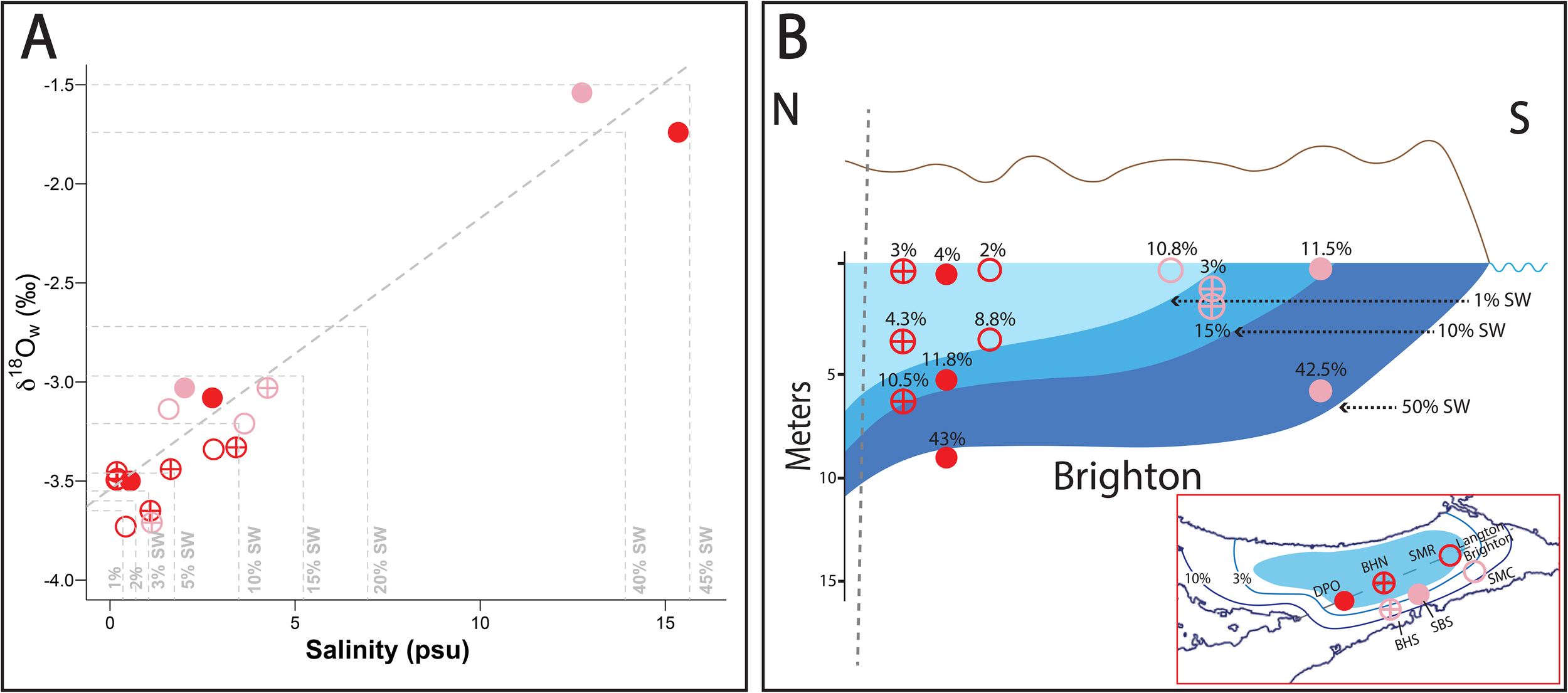 (A) δ18Ow and salinity data of six well sites. Points deviated from the mixing line are estimated using either δ18Ow or salinity, and an averaged number is shown. (B) Schematic cross section of the Devonshire Lens, showing the Brighton Aquifer and isolines representing the amount of mixing based on relative salinity (modified from Vacher, 1978). The six well locations are plotted as function of sample depth, with percentages indicating percent seawater based on the mixing relationship shown in (A).