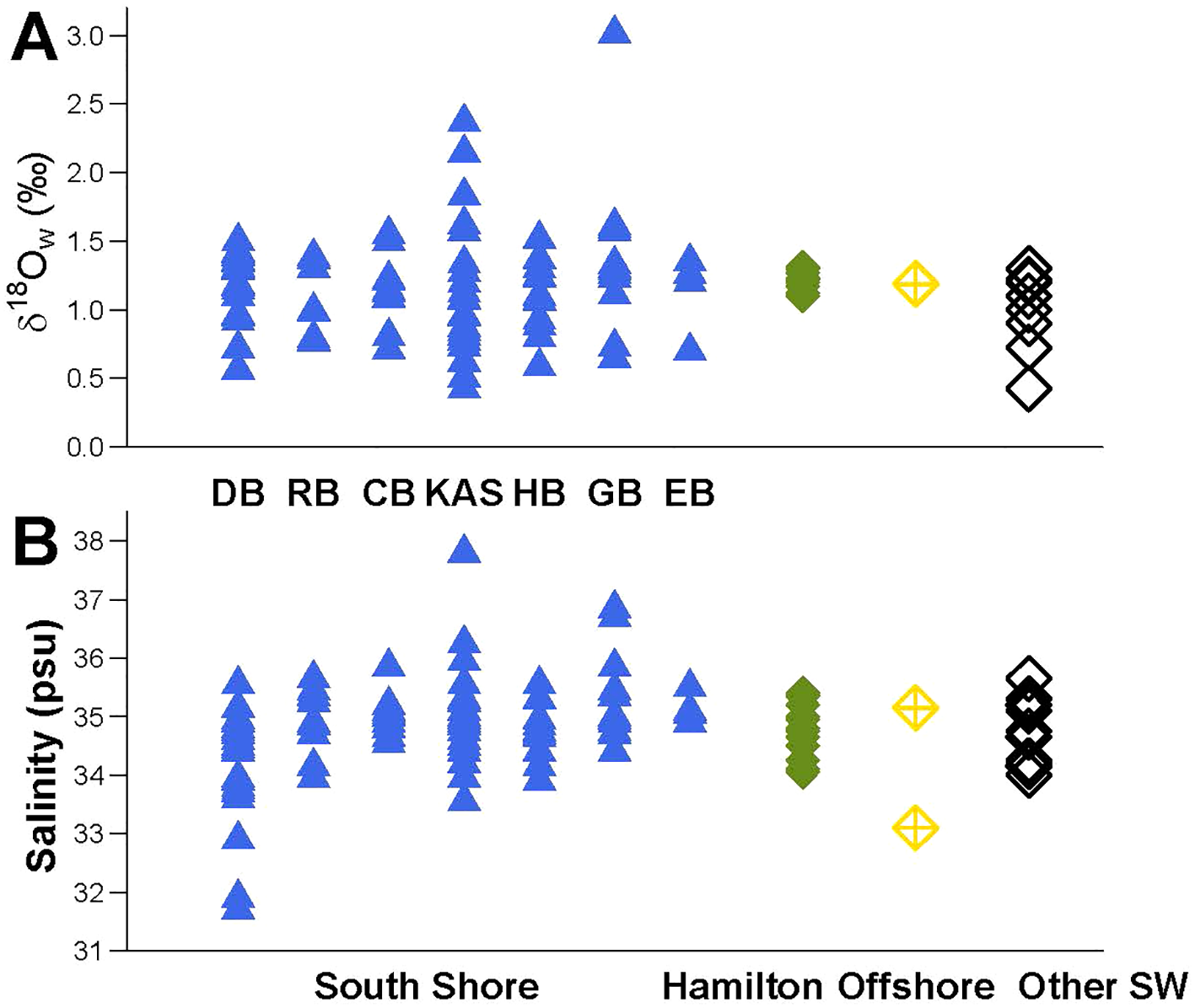 Well-water samples from the transition zone show a clear mixing relationship between salinity and δ18Ow (Figure 6A), defined by Equations 1 and 2, but South Shore seawater samples do not plot along the same mixing line (Figure 6). Excluding high salinity outliers that are likely due to evaporative enrichment (KAP/KAS and GB) and low salinity outliers driven by closest proximity to the lens and/or coastal geometry (DB), the vast majority of other salinity values fall within the stable, narrow range seen at Hamilton (~34.1-35.4 psu) (Figure 8), despite these same sites demonstrating >1‰ variability in δ18Ow. Equations 1, 2 predict a roughly ~7 psu decrease in salinity for every 1‰ decrease in δ18Ow due to mixing with pure aquifer water, a magnitude of salinity change that is not seen.