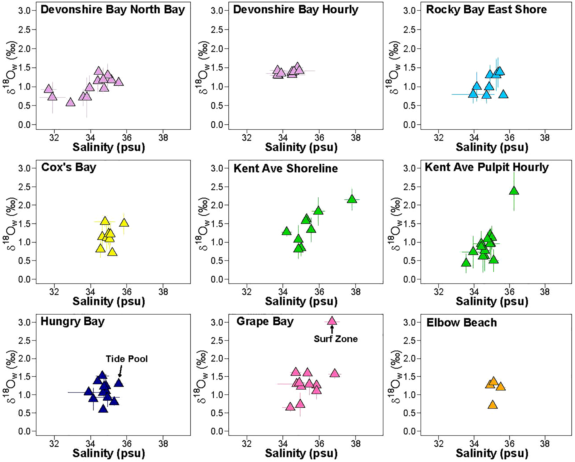 Along the South Shore, δ18Ow ranged from 0.6 to 3.0‰ and salinity ranged from 31.7 to 38.5 psu (Figures 5, 7). The wide salinity range is mainly driven by samples from DBNB on the lower end and GB on the higher end. Without these two sites, the South Shore salinity ranges roughly from 34 to 36psu, similar to the temporally invariant non-South Shore site of Hamilton. The range of variability in δ18Ow is artificially expanded due to one very enriched point from Grape Bay (3.0‰), which was collected in the surf zone, and likely reflects evaporative enrichment. All other samples from Grape Bay were collected in knee-height water. Without this one point, although the total range is reduced, South Shore seawater samples still vary considerably in δ18Ow, ranging from 0.6 to 2.1‰. This variability far exceeds the narrow range in δ18Ow seen in Hamilton and other non-South Shore sites.