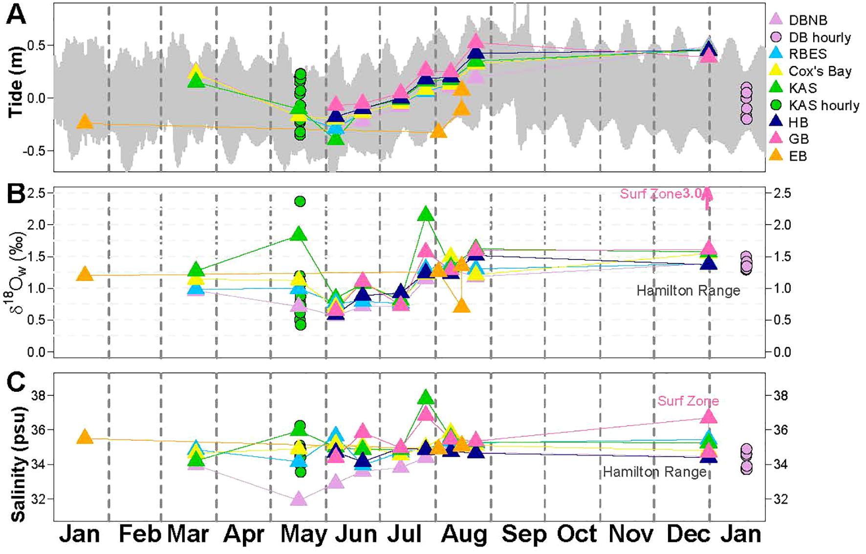 Individual high δ18Ow outliers at KAP/KAS and GB occur in May, late July, and to a lesser degree, late June. These high δ18Ow values tend to correspond to higher salinities as well, suggesting evaporative enrichment as the cause. As discussed above, unlike the other rocky shorelines, the KAP/KAS site has a coastal geometry that appears to make it susceptible to restriction and evaporative enrichment. The finding of samples from GB with elevated salinity and δ18Ow values may be explained by evaporative enrichment as well. GB is a very gently sloping, sandy beach where waves wash over large horizontal distances, promoting evaporative enrichment over subsequent wave cycles. Most GB samples were taken from the surface in knee-depth water. In December 2021, one sample was taken from the surf zone, extremely close to shore in only inches of water. This sample showed significant evaporative enrichment, with a δ18Ow value of 3.0‰ and a salinity of 36.7 psu. This suggests that evaporative enrichment is happening in the shallowest water, which would have influenced δ18Ow values and salinity of collected knee-depth waters to a varying degree based on daily conditions such as wind speed, direction, wave height, etc.